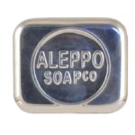 Aleppo zeepdoosje van aluminium met opschrift “aleppo soap co”. In dit doosje past een Aleppo zeep.