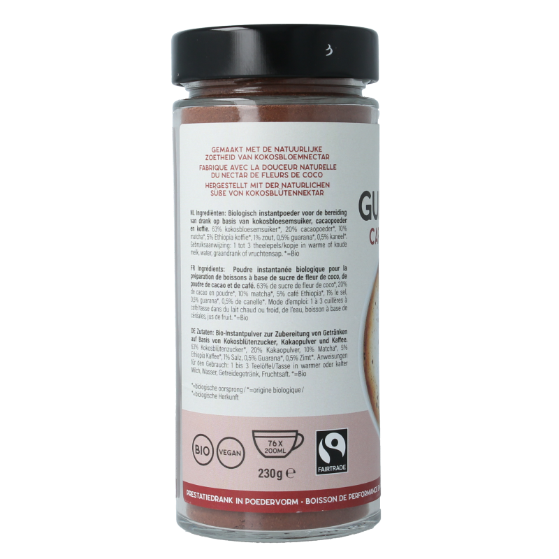 Biologisch instantpoeder voor de bereiding van drank op basis van kokosbloesemsuiker, cacaopoeder en koffie.