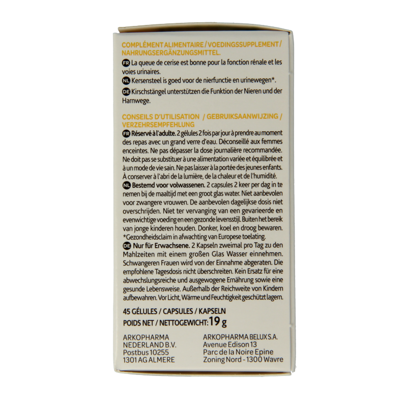 Poeder van de bloemsteel van de vrucht van de kriekenboom (Prunus cerasus), capsule 100% plantaardig: hydroxypropylmethylcellulose.
