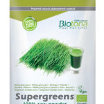 Het mengsel bestaat uit 100% pure groene voedselbronnen, elk met hun waaier aan fytonutriënten en natuurlijk aanwezige voedingsstoffen. Biotona Supergreens bevat het poeder van tarwegras-, havergras-, luzernegras-, kamut® khorasangras- en gerstegrassap. Daarnaast bevat deze mix chlorella en spirulina, twee superalgen die vanwege hun superieure nutritionele samenstelling, rijk aan proteïnen, een ideale en volledige voedingsbron vormen. Bevat verder gevriesdroogd poeder van broccoli, kale en spinazie, boordevol waardevolle stoffen en zeewieren uit Schotland (Seagreens® blaaswier en knotswier), één voor één met een breed en uniek nutritioneel profiel.