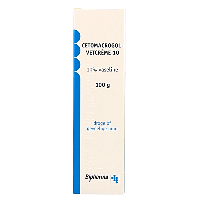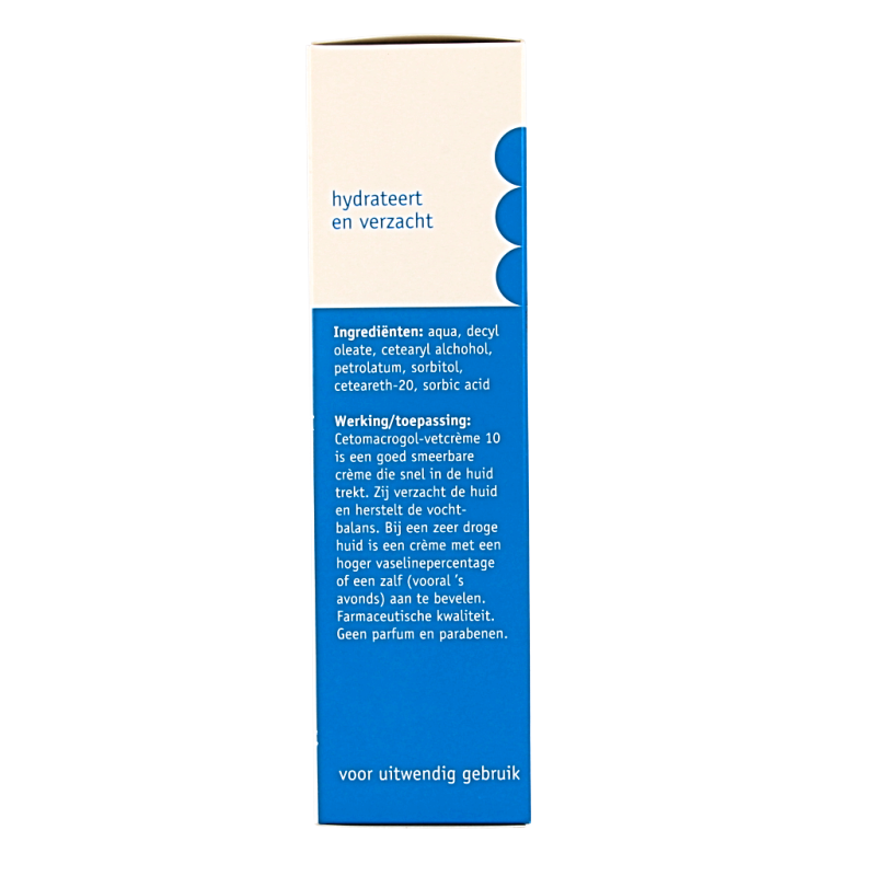 Cetomacrogol-vetcrème 10 is een goed smeerbare crème die snel in de huid trekt. Zij verzorgt de huid en herstelt de vochtbalans.