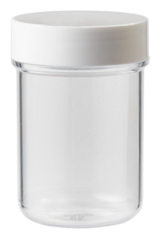 Plastobel pot geproduceerd van het materiaal PS (polystyreen) transparant met opgeschroefde gladde PP dop (Polypropyleen) Geschikt voor verpakken van o.a. tabletten, dragees en capsules.