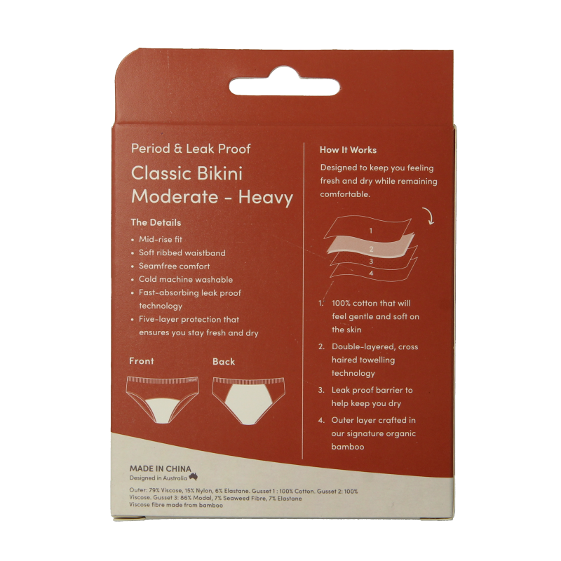 Elk paar Boody menstruatie- en lekvrij ondergoed is voorzien van onze kenmerkende, innovatieve ingebouwde technologie: een vochtafvoerende bovenlaag, absorberende kernlagen en een lekvrije barrière. Onze Classic Bikini menstruatieslip heeft een zacht geribbelde tailleband en een middelhoge taille. Deze klassieke, eenvoudige snit geeft je een gemiddeld tot volledige bedekking en is een fijne keuze voor dagelijks gebruik.