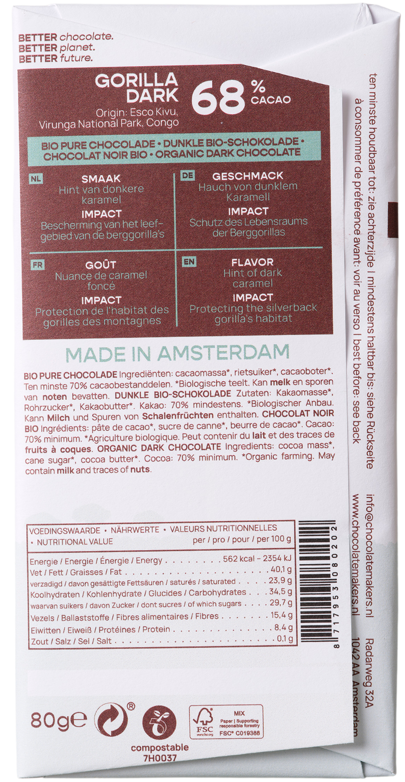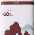 Pure chocolade gemaakt met Forastero cacabonen uit Congo – Virunga National Park, waar de laatste berggorilla’s leven. De cacao voorziet de bewoners van extra inkomen.