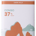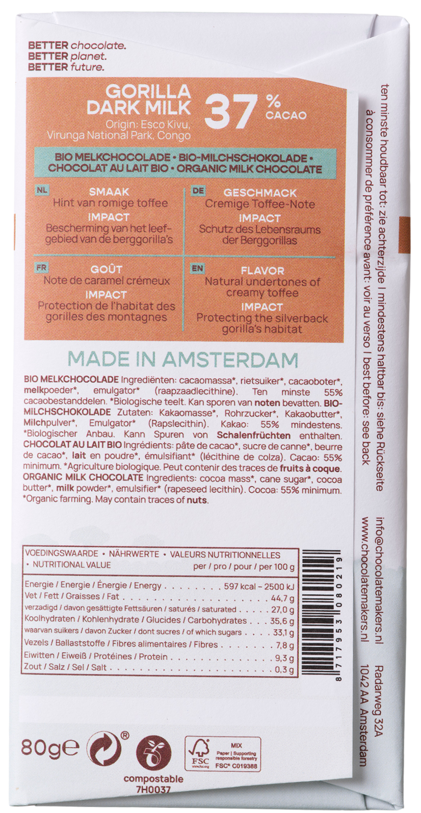 Melkchocolade gemaakt met Forastero cacabonen uit Congo – Virunga National Park, waar de laatste berggorilla’s leven. De cacao voorziet de bewoners van extra inkomen.