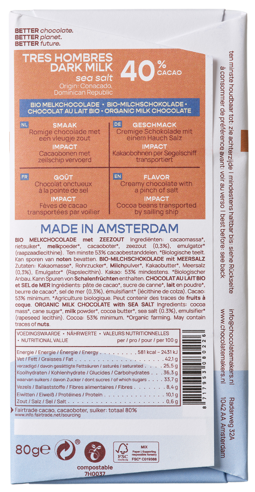 Frisse romige melkchocola met de smaak van karamel, amandel en een vleugje zeezout. De cacao van deze reep wordt met het zeilschip de Tres Hombres puur op windkracht naar de haven van Amsterdam gezeild.