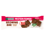 chocolade met zoetstof (24%) (cacaomassa, zoetstof (maltitol), cacaoboter, emulgator (lecithinen), natuurlijk vanillearoma), veganistische eiwitten (SOJA-eiwit, erwten-eiwit, rijsteiwit), bevochtigingsmiddel (glycerol), samengestelde coating met zoetstof en voedingsvezels (zoetstof (maltitol), cacaoboter, voedingsvezels (oligofructose), cacaomassa, rijstbloem, emulgator (lecithinen), natuurlijk cacao-aroma, natuurlijk vanillearoma), voedingsvezel (polydextrose), SOJA-cacaochips (4%) (SOJA-eiwit, cacaopoeder, tapiocazetmeel), zonnebloemolie, vetgereduceerd cacaopoeder (gealkaliseerd) (vetgereduceerd cacaopoeder, zuurteregelaars (ammoniumcarbonaten, kaliumcarbonaten, kaliumhydroxide)), aroma”s, natuurlijke aroma”s, zoetstof (sucralose)
