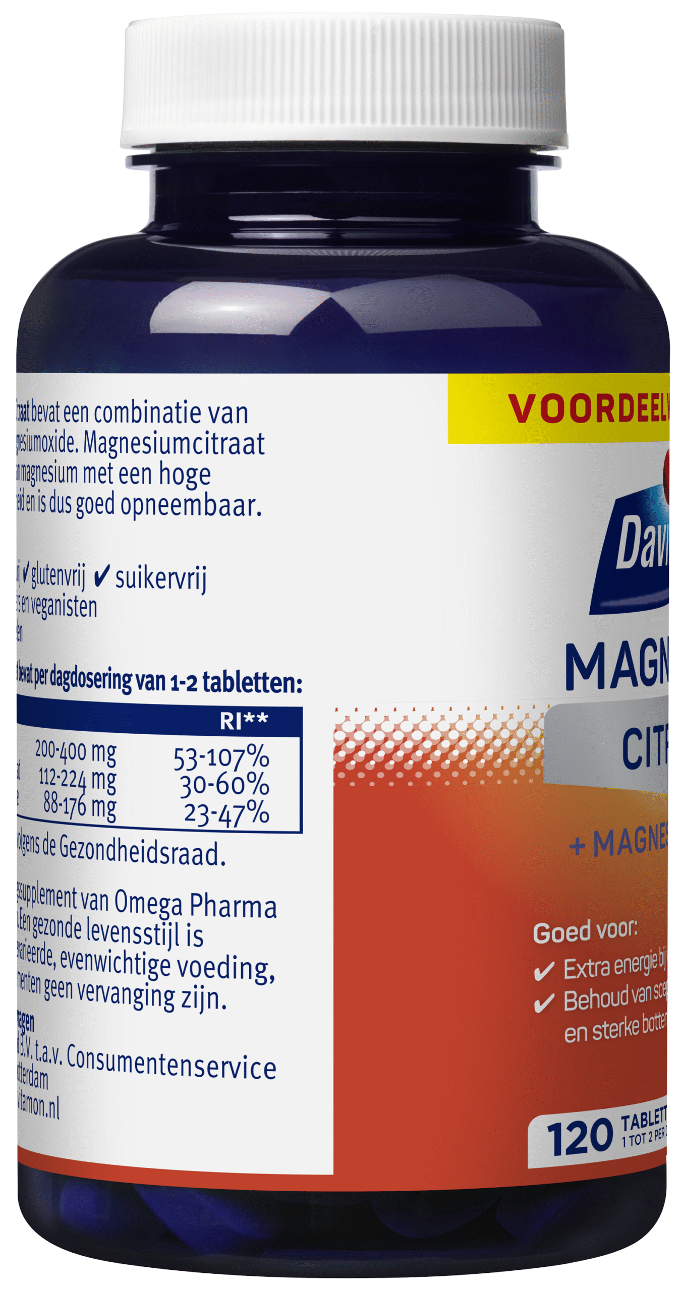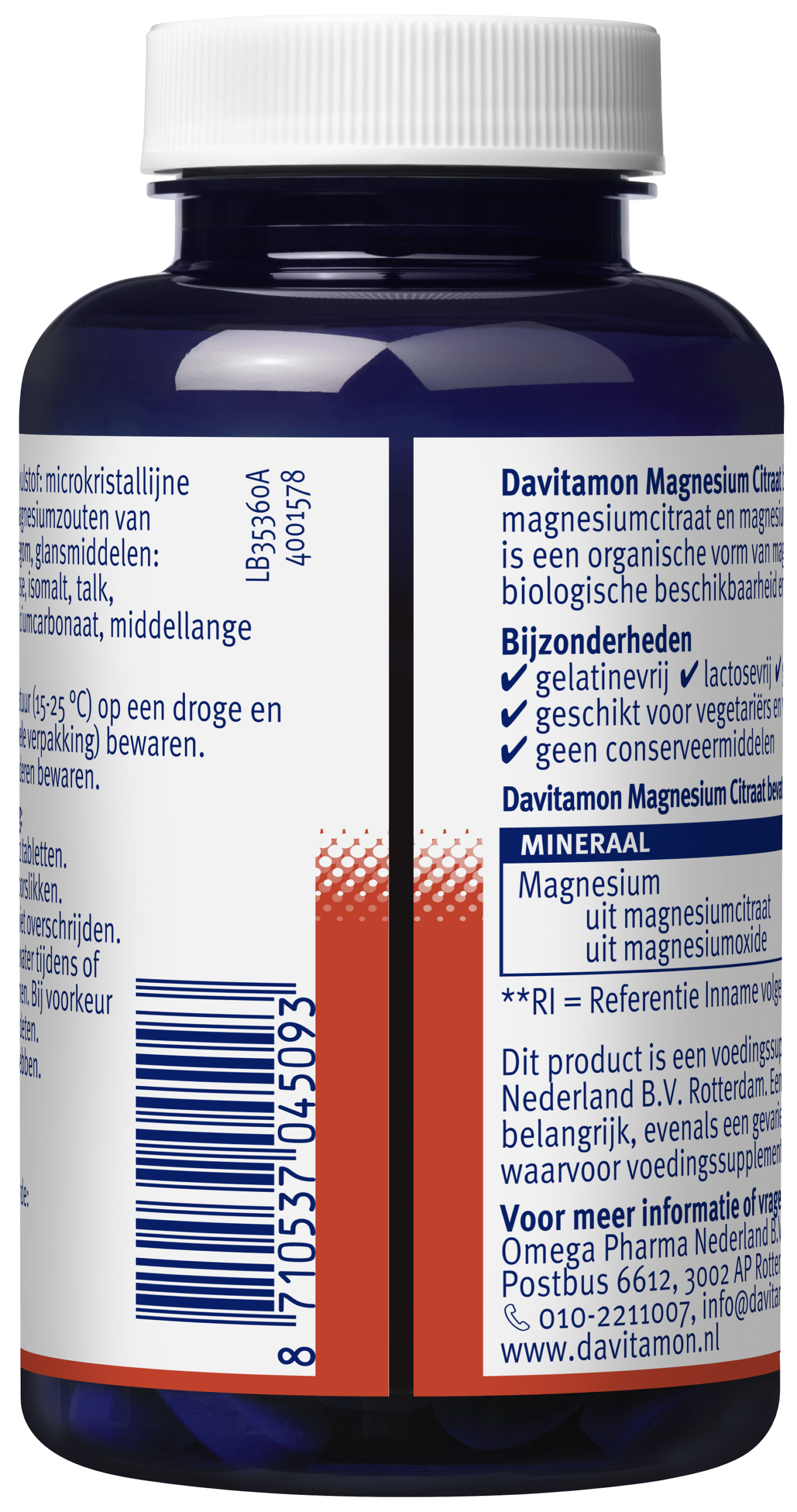 Davitamon Magnesium Citraat bevat een combinatie van magnesiumcitraat en magnesiumoxide. Magnesiumcitraat is een organische vorm van magnesium met een hoge biologische beschikbaarheid en is dus goed opneembaar.