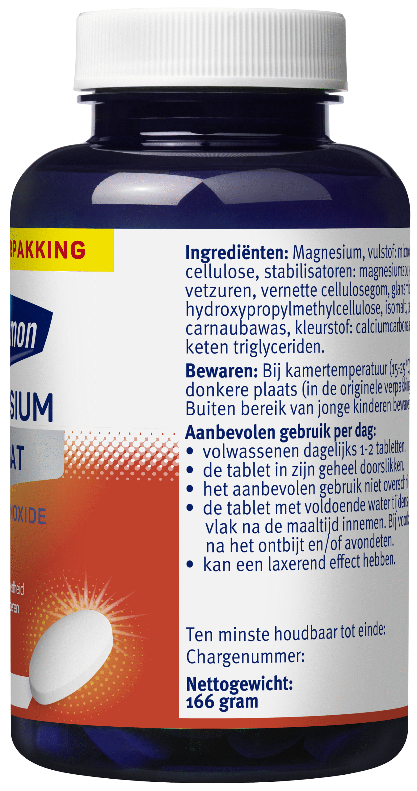 Magnesium, vulstof: microkristallijne cellulose, stabilisatoren: magnesiumzouten van vetzuren, vernette cellulosegom, glansmiddelen: hydroxypropylmethylcellulose, isomalt, talk, carnaubawas, kleurstof: calciumcarbonaat, middellange keten triglyceriden.
