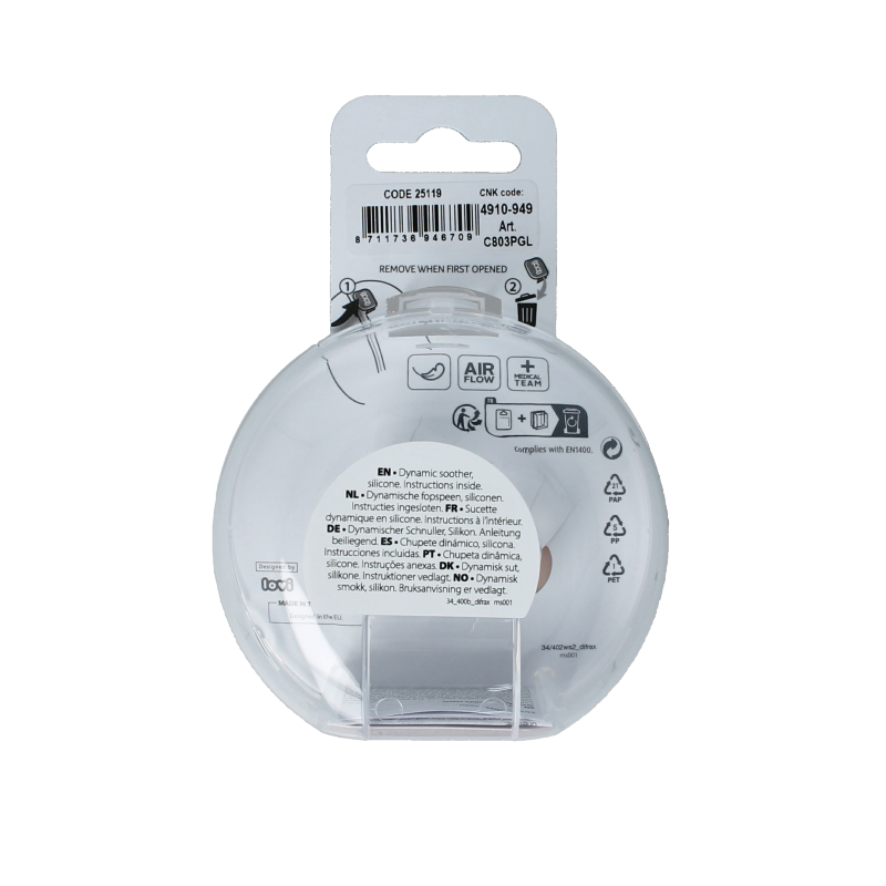 De Dynamische Prime Glow fopspeen sluit optimaal aan bij de natuurlijke zuigbehoefte van baby’s, dag en nacht.