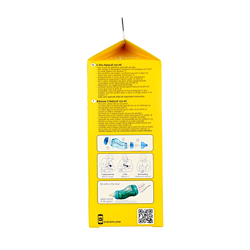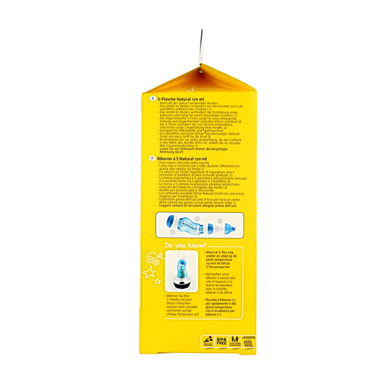 De unieke S-fles is vanaf de geboorte (ook bij premature baby”s) te gebruiken. De S-fles heeft een afschroefbare bodem. Zo kun je de S-fles makkelijk vullen met ijsblokjes moedermelk en na gebruik eenvoudig reinigen. Borstvoeding kun je rechtstreeks in de S-fles Natural kolven met de mamavriendelijke Difrax borstkolf.