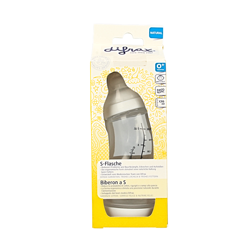 De Difrax S-fles Natural 170 ml is de populairste babyfles voor baby, papa en mama. Het speciale anti-darmkrampjes ventiel en de S-vorm zorgen voor een constante stroom van flesvoeding. De S-fles Anti-colic is vanaf de geboorte te gebruiken en ideaal in combinatie met borstvoeding.
