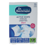 Op uw witte was ontstaat na verloop van tijd een grauwsluier. Dat komt door het vele wassen en door de reststoffen die in het zeepsop achterblijven. Als uw witte was lang in de kast ligt, kan er ook nog vergeling optreden. Dr. Beckmann Active-White doekjes zorgen er met een uitgekiende combinatie van optische witmakers voor dat die grauwsluier en vergeling verdwijnen. Zo wordt uw was is weer stralend wit. Als u de doekjes regelmatig gebruikt behoudt uw witte was haar helderheid.