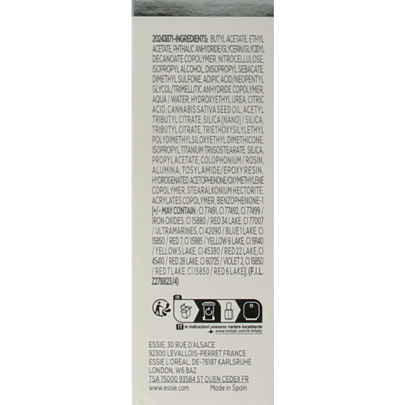 Butyl acetate, ethyl acetate, phthalic anhydride/glycerin/glycidyl decanoate copolymer, nitrocellulose, isopropyl alcohol, diisopropyl sebacate, dimethyl sulfone, adipic acid/neopentyl glycol/trimellitic anhydride copolymer, aqua/water/eau, hydroxyethyl urea, citric acid, cannabis sativa seed oil, acetyl tributyl citrate, silica ,tributyl citrate, triethoxysilylethyl polydimethylsiloxyethyl dimethicone, isopropyl titanium triisostearate, propyl acetate, colophonium/rosin/colophane, alumina, tosylamide/epoxy resin, hydrogenated acetophenone/oxymethylene copolymer, stearalkonium hectorite, acrylates copolymer, benzophenone-1