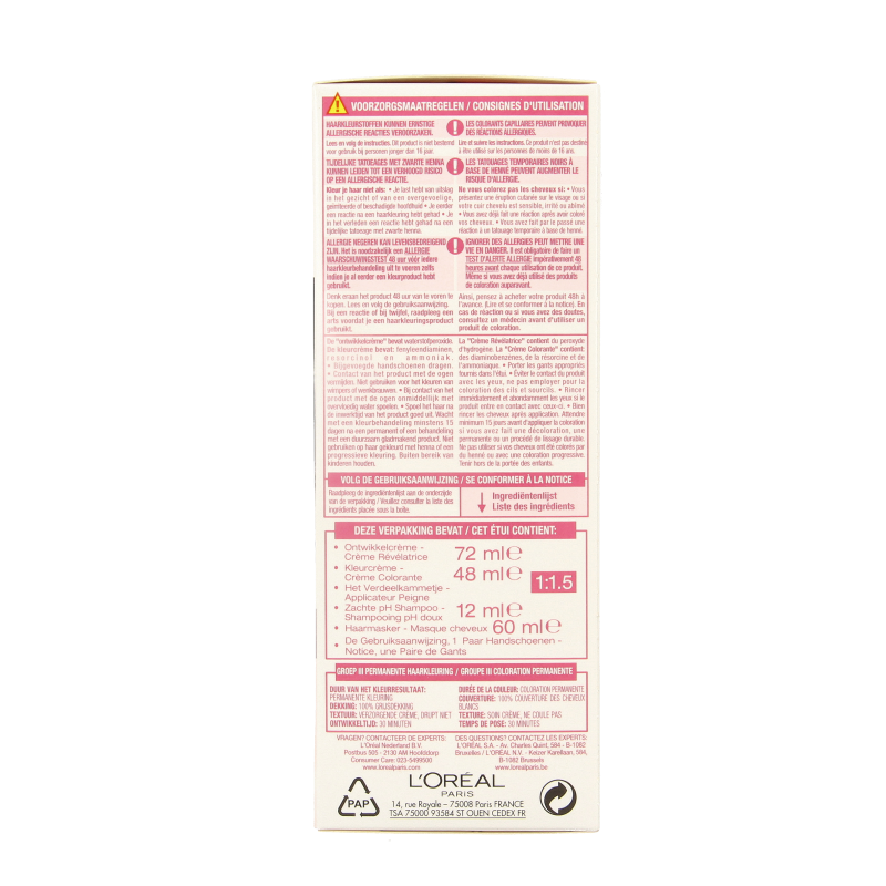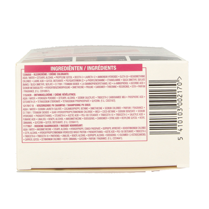 Aqua/water, Cetearyl alcohol, Propylene glycol, Deceth-3, Laureth-12, Ammonium hydroxide, Oleth-30, Hexadimethrine chloride, Lauric acid, Glycol distearate, Polyquaternium-22, p-Phenylenediamine, Ethanolamine, Silica dimethyl silylate/silica dimethyl silylate, CI 77891/titanium dioxide, 2,4-diaminophenoxyethanol HCI, m-Aminophenol, Ascorbic acid, Sodium metabisulfite, Hydroxybenzomorpholine, Dimethicone, Proline, Carbomer, Threonine, Resorcinol, EDTA, Parfum/fragrance F.I.L. C201895/1)