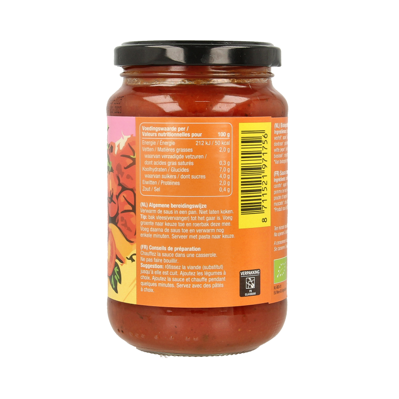 Tomaten* (69%), water, tomatenpuree*, uien*, wortel*, agave*, olijfolie*, groentebouillon* (zout, aardappelzetmeel*, dextrose*, gistextract*, preipoeder*, uienpoeder*, kurkuma*, thijm*, witte peper*, laurier*, nootmuskaat*, kruidnagel*), basilicum*, bieslook*, oregano*, zwarte peper*.