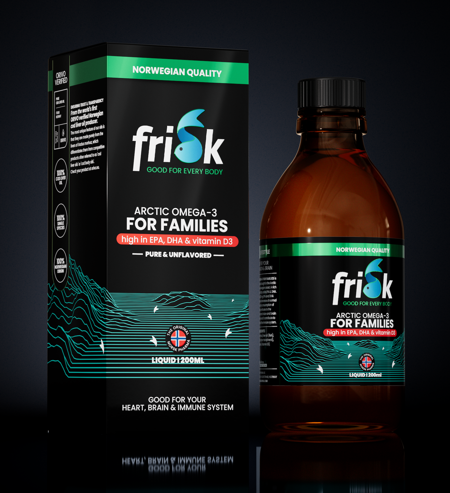 Frisk Arctic Omega-3 for Families is een premium Noors omega-3 supplement met zuivere kabeljauwleverolie, rijk aan DHA en EPA in natuurlijke vorm, aangevuld met vitamine D3. Met een pure en natuurlijke smaak, ideaal voor zowel kinderen als volwassenen. Duurzaam geproduceerd in Noorwegen en ORIVO-gecontroleerd op herkomst en zuiverheid.