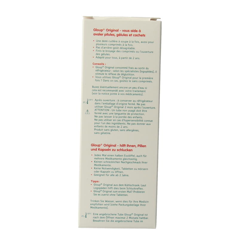 Logopedisten adviseren om Goup original gekoeld te gebruiken, omdat dit de slikreflex versterkt. Leg de medicijnen op een geschikte lepel. Knijp dan een kleine hoeveelheid Gloup original direct vanuit de tube op de pillen of capsules. Meestal is 5 ml genoeg, oftewel een halve eetlepel Gloup original. Breng alles in de mond en slik in één keer door.