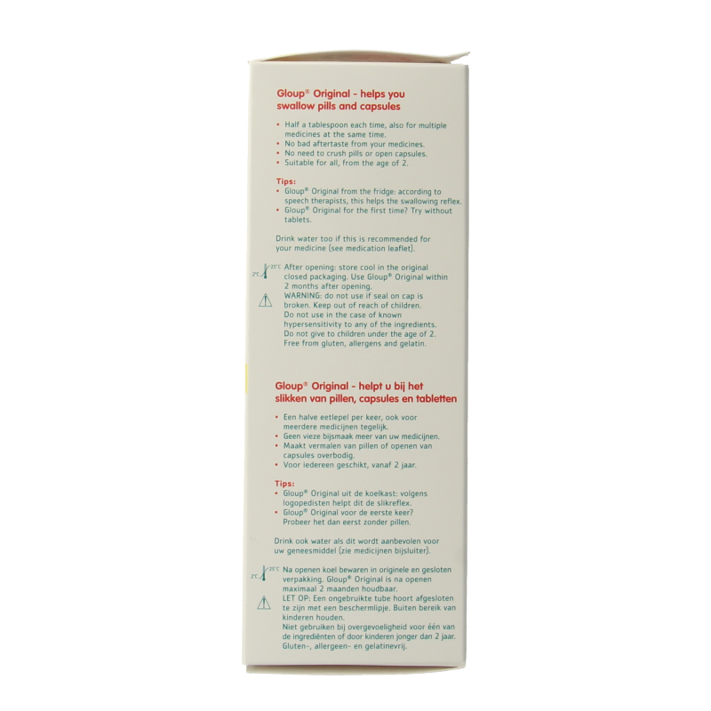 Gloup original is niet speciaal ontwikkeld of bestemd voor patiënten met afwijkingen aan de slikorganen. Ook vormt Gloup original geen oplossing voor patiënten die zich verslikken bij het innemen van vaste substanties. Gloup original is niet bestemd voor het slikken van geneesmiddelen in vloeibare of dispengeerbare vorm. Wanneer u overgevoelig bent voor een of meerdere bestanddelen van Gloup, wordt u geadviseerd voor gebruik uw arts of apotheker te raadplegen. Neem in zo”n geval altijd uw tube Gloup original mee. Indien u geen suiker wilt of mag gebruiken heeft het gebruik van Gloup Zero de voorkeur boven Gloup original.