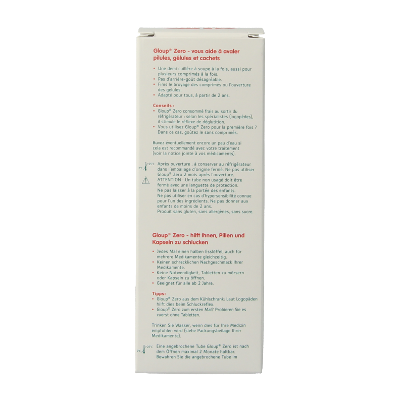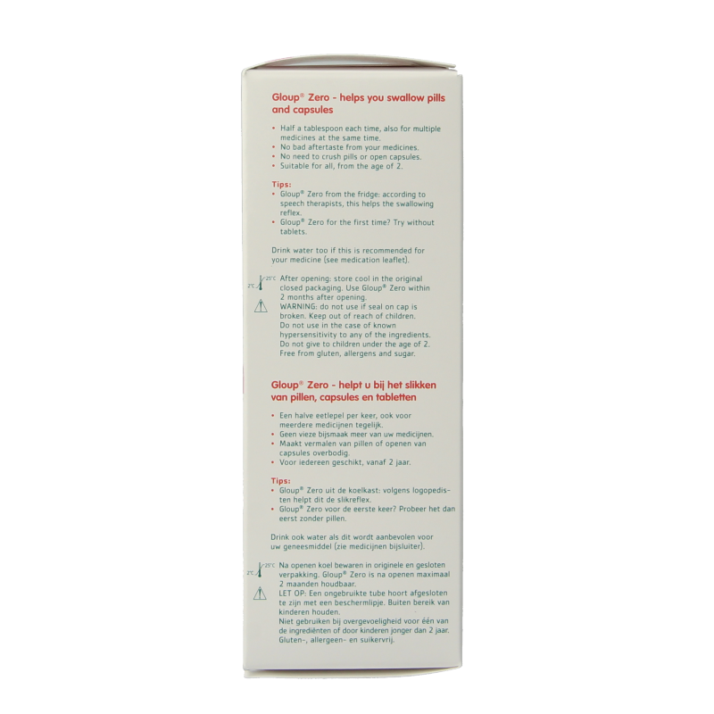 Gloup Zero is niet speciaal ontwikkeld of bestemd voor patiënten met afwijkingen aan de slikorganen. Ook vormt Gloup Zero geen oplossing voor patiënten die zich verslikken bij het innemen van vaste substanties. Gloup Zero is niet bestemd voor het slikken van geneesmiddelen in vloeibare of dispergeerbare vorm. Wanneer u overgevoelig bent voor een of meerdere bestanddelen van Gloup, wordt u geadviseerd voor gebruik uw arts of apotheker te raadplegen. Neem in zo”n geval altijd uw tube Gloup Zero mee.