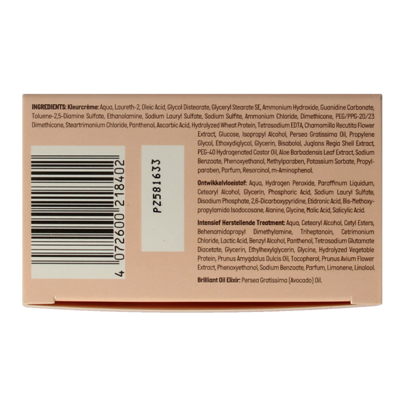 Kleurcrème: Aqua, Laureth-2, Oleic Acid, Glycol Distearate, Glyceryl Stearate SE, Ammonium Hydroxide, Guanidine Carbonate, Toluene-2,5-Diamine Sulfate, Ethanolamine, Sodium Lauryl Sulfate, Sodium Sulfite, Ammonium Chloride, Dimethicone, PEG/PPG-20/23 Dimethicone, Steartrimonium Chloride, Panthenol, Ascorbic Acid, Hydrolyzed Wheat Protein, Tetrasodium EDTA, Chamomilla Recutita Flower Extract, Glucose, Isopropyl Alcohol, Persea Gratissima Oil, Propylene Glycol, Ethoxydiglycol, Glycerin, Bisabolol, Juglans Regia Shell Extract, PEG-40 Hydrogenated Castor Oil, Aloe Barbadensis Leaf Extract, Sodium Benzoate, Phenoxyethanol, Methylparaben, Potassium Sorbate, Propylparaben, Parfum, Resorcinol, m-Aminophenol.