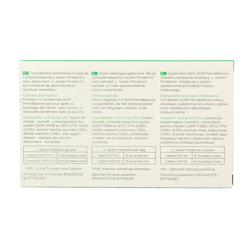 | Limosilactobacillus reuteri Prodentis® | 18 mg van elke stam *2 x 10KVE* |
