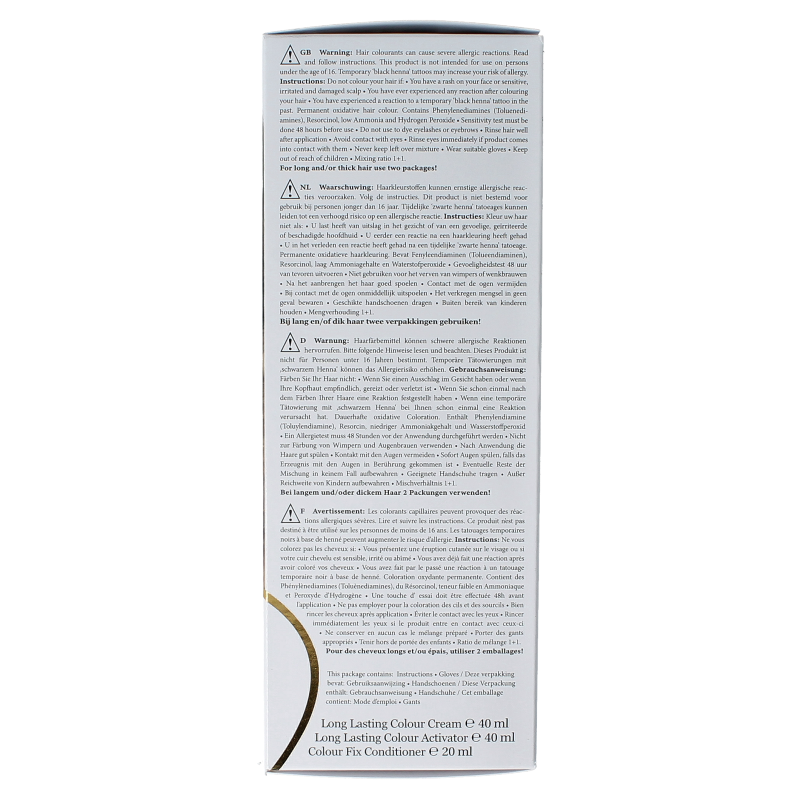 Voer iedere keer dat u uw haar kleurt, 48 uur voor de toepassing een allergie-test uit, ook wanneer al eerder haarkleurproducten zijn toegepast. De test op ca. 1 cm x 1 cm huidoppervlak in de elleboog uitvoeren. Een beetje kleurcrème (tube) met een wattenstokje dun aanbrengen in de elleboog en 45 minuten onbedekt laten inwerken. Tube goed sluiten. Na 45 minuten het product grondig met water van de huid afwassen.