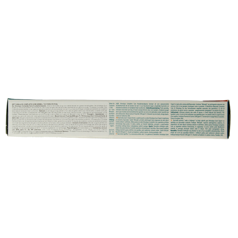 Complete Care kruidentandpasta is een geavanceerde formule die 12 uur lang bescherming biedt tegen schadelijke ziektekiemen en verwijdert vlekken en plakvorming. Complete Care kruidentandpasta bevat calcium fluoride (500 ppm). De Himalaya Herbals Gum Expert lijn bevat tandpasta’s met Miswak en natuurlijke reinigers die het tandvlees beschermen en gezond houden. Gezond tandvlees zorgt voor sterke tanden en goede mondhygiëne.