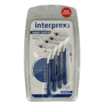 Interprox Plus Plus Super Conical Donkerblauw is speciaal ontwikkeld voor het reinigen van de ruimten tussen tanden vóór in de mond. Cariës (gaatjes) en tandvleesontstekingen beginnen vaak tussen tanden en kiezen. Deze ruimte reinig je het meest effectief met een interdentaal borsteltje. Een borsteltje is effectiever dan tandenstokers of rubbersticks. De borsteltjes van Interprox zijn voor dagelijks gebruik en gaan langer mee. Omdat de interdentale ruimten tussen tanden en kiezen varieert, is het belangrijk om voor iedere specifieke situatie het meest geschikte borsteltje te kiezen. Vraag je mondzorgprofessional welke maat het meest geschikt is. Interprox Plus Super Conical Donkerblauw heeft een gehoekt handvat en beschikt over een cylindrisch gevormde borstelkop met PHD maat 2.0.
