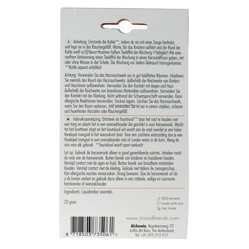 Harswierook Storaxhars is een hars die afkomstig is van de Liquidambar orientalis, een boom die in Turkije voorkomt. Deze Turkse Storax heeft een zoete, balsamico geur met houtachtige en harsachtige nuances. Het wordt zeer gewaardeerd vanwege zijn kalmerende en geruststellende aroma. De harsen van Jiri & Friends zijn volledig natuurlijk en stimuleren gevoelens, emoties en sensaties. Dit eeuwenoude ingrediënt wordt al lange tijd gebruikt om de geest te zuiveren en een aangename, zoete geur te verspreiden. Het ondersteunt ook bij spiritualiteit en meditatie.