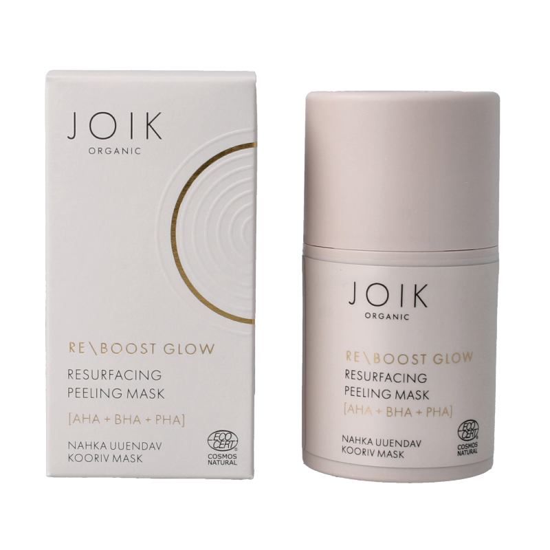 JOIK Organic Re-boost Glow AHA+BHA+PHA Resurfacing Peeling Mask is een verjongende peelingmasker, verrijkt met AHA-, BHA- en PHA-zuren.