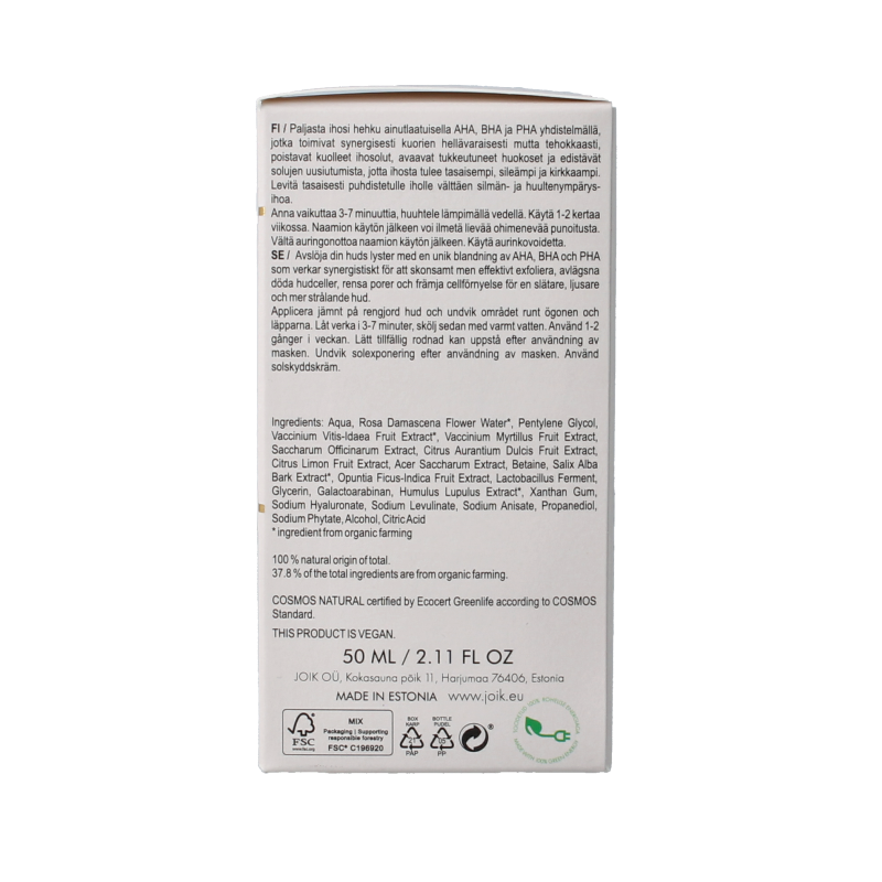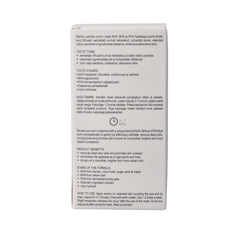 Dit masker exfolieert de huid op een milde maar effectieve manier, verwijdert dode huidcellen, maakt de poriën vrij en bevordert de huidvernieuwing voor een gladdere, stralendere teint. Het werkt op verschillende lagen van je huid dankzij een slimme mix van natuurlijke zuren zoals AHA uit bessen, citrusvruchten en esdoorn, BHA uit wilgenbast en PHA uit gefermenteerde cactusvijg. Extra verzorging Naast de zuren bevat het masker nog meer fijne ingrediënten. Bosbessenextract beschermt je huid tegen stress van buitenaf, rozenwater kalmeert en hydrateert, en vitamine C geeft je huid extra glans.
