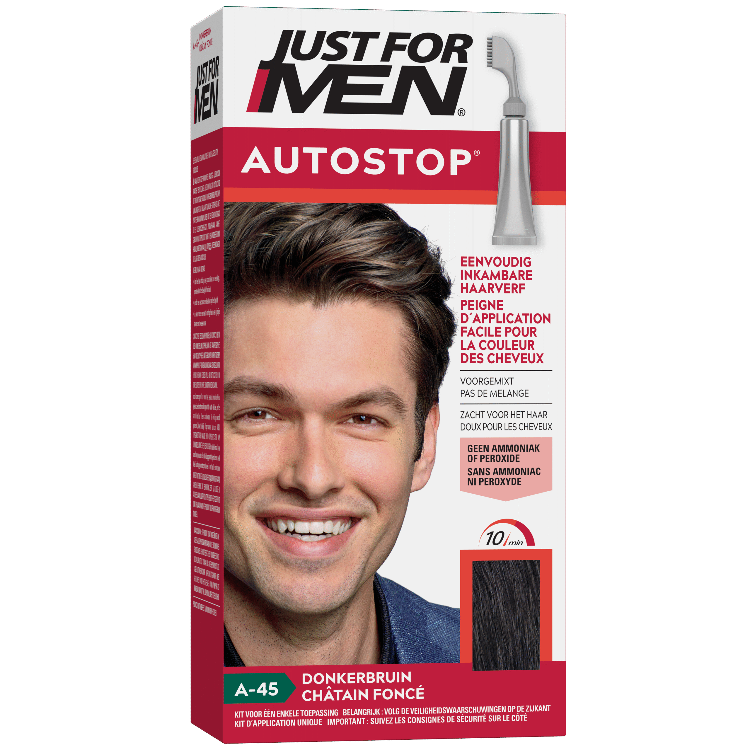 Just For Men Autostop Donkerbruin Haarkleuring is speciaal voor mannen. Niet alleen vrouwen vinden het vervelend om grijs haar te krijgen. Mannen hebben hier soms moeite mee, hoewel het ook erg aantrekkelijk kan zijn. Wil je toch gewoon je eigen haarkleur terug, gebruik dan Just For Men Autostop Donkerbruin. Just for Men Autostop Donkerbruin is een eenvoudige haarkleuring die grijze haren gemakkelijk laat verdwijnen. De innovatieve door de lucht geactiveerde formule zorgt ervoor dat de subtiele kleurvariaties van het haar behouden blijven. Het stopt precies wanneer de juiste kleur is bereikt, voor perfect resultaat. Elke keer weer.
