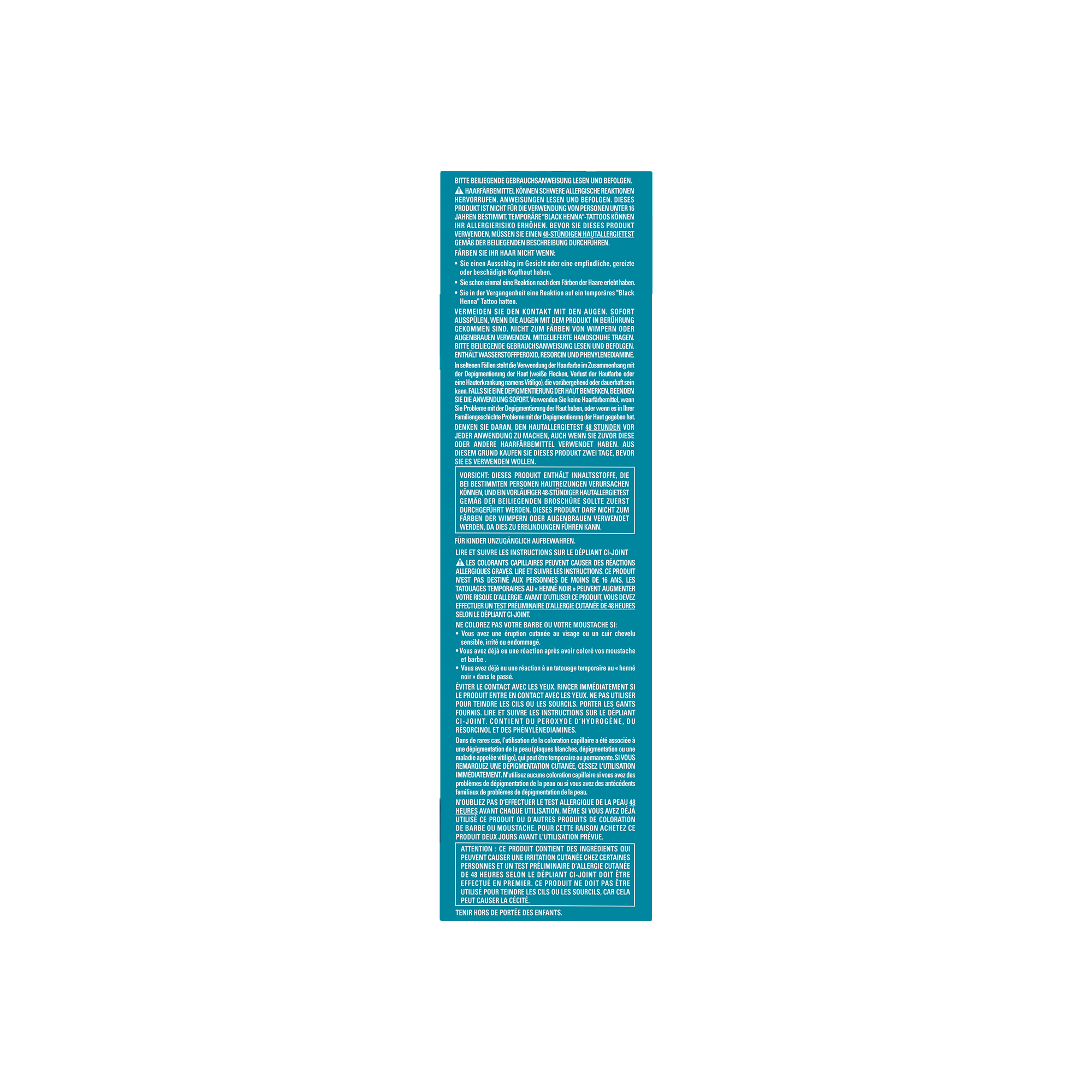 HAARKLEURSTOFFEN KUNNEN ERNSTIGE ALLERGISCHE REACTIES VEROORZAKEN. LEES EN VOLG DE INSTRUCTIES. DIT PRODUCT IS NIET GESCHIKT VOOR PERSONEN JONGER DAN 16 JAAR. TIJDELIJKE TATOEAGES MET ZWARTE HENNA KUNNEN LEIDEN TOT EEN VERHOOGD RISICO OP EEN ALLERGISCHE REACTIE. VOORAFGAAND AAN HET GEBRUIK VAN DIT PRODUCT MOET U EEN VOORBEREIDENDE HUIDALLERGIETEST VAN 48 UUR UITVOEREN, OVEREENKOMSTIG DE BIJGESLOTEN BROCHURE.