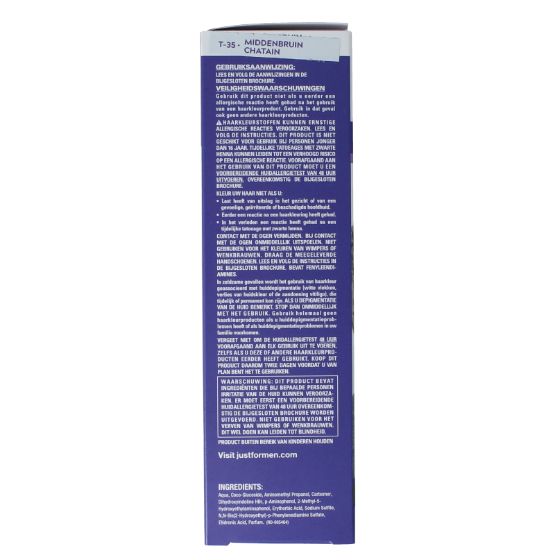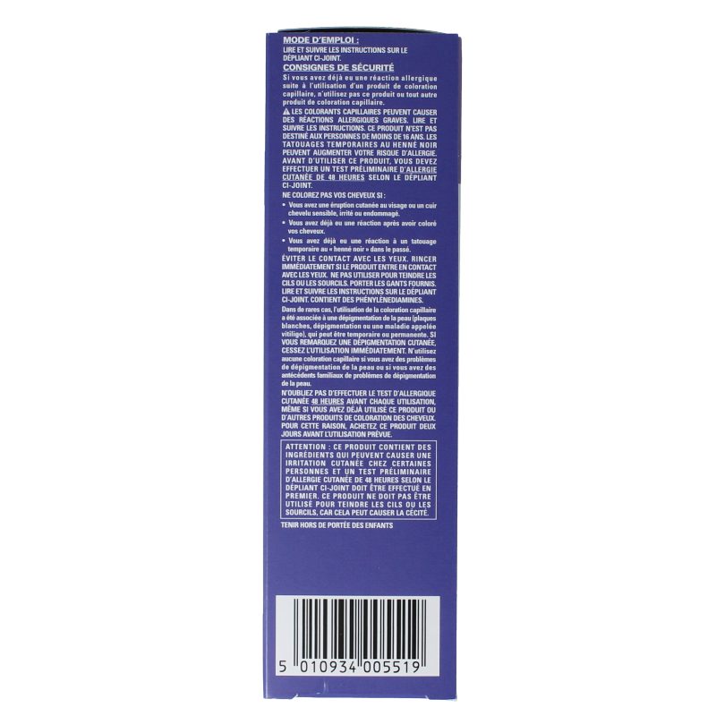 Dit product bevat ingrediënten die bij bepaalde personen irritatie van de huid kunnen veroorzaken. Er moet eerst een voorbereidende huidallergietest van 48 uur overeenkomstig de bijgesloten brochure worden uitgevoerd. Niet gebruiken voor het verven van wimpers of wenkbrauwen. Dit wel doen kan leiden tot blindheid.