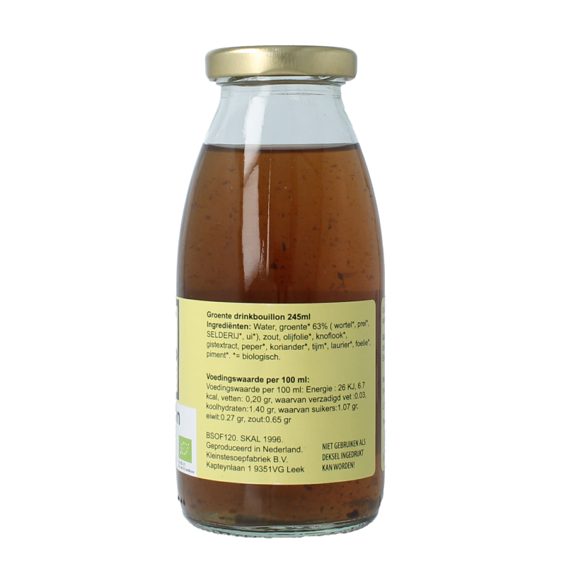 Water, groente* 63% (wortel*, prei*, SELDERIJ, ui*), zout, olijfolie*, knoflook*, gistextract, peper*, koriander*, tijm*, laurier*, foelie*, piment*.
