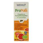 Bio voedingssupplement. Dit bio concentraat van Ladrôme combineert de weldadige werking van propolis met pompelmoespittenextract. Door de rijkdom aan bioflavonoïden (700 mg/100 ml) en de afwezigheid van alcohol en glycerine is dit BIO concentraat geschikt voor iedereen, in het bijzonder tijdens de winter.