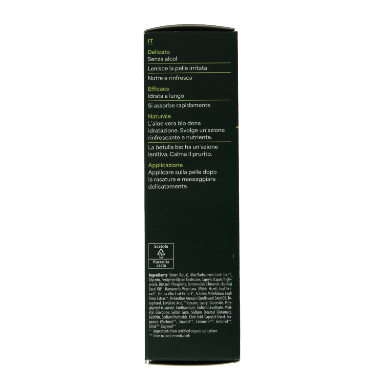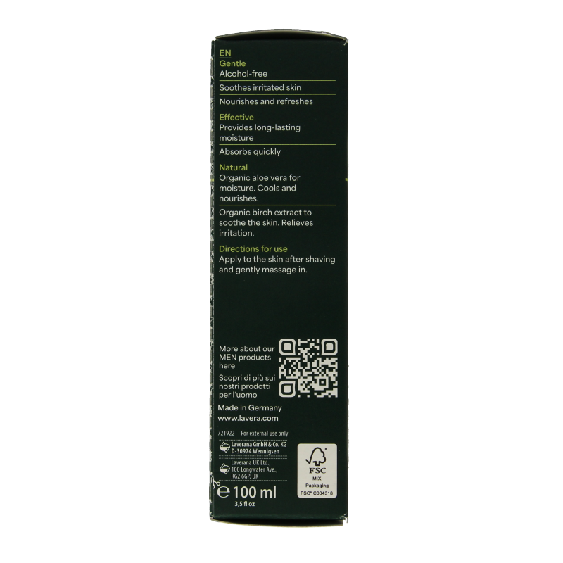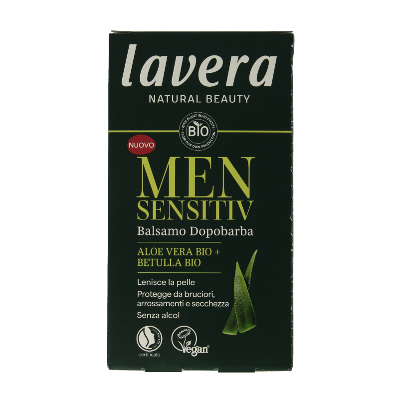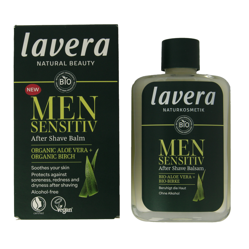 Zacht en zeer effectief: lavera Men Sensitiv After Shave Balm. Zonder alcohol, voorkomt een brandend gevoel van de huid, roodheid en een droge huid. Hydraterende, biologische aloe vera en biologische berk hyrateren, kalmeren en verfrissen. De balsem wordt snel geabsorbeerd en is natuurlijk vrij van kunstmatige kleurstoffen en conserveringsmiddelen*. (*volgens de EU-Cosmetica verordening)
