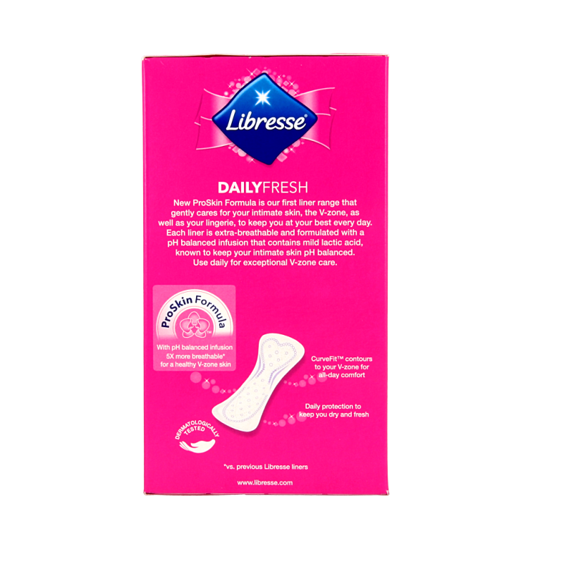Libresse Normal inlegkruisjes zijn zacht voor de huid en voelen uiterst comfortabel aan. De huidvriendelijke materialen zorgen ervoor dat je nauwelijks voelt dat je ze draagt. Libresse Normal inlegkruisjes houden vocht tegen en laten warmte en lucht door. Zo kan je huid op een natuurlijke manier ademen. Door de ProSkin Formula™ zijn ze verrijkt met PH neutraal melkzuur om de gevoelige huid van de V-zone te verzorgen. Libresse CurveFit™ inlegkruisjes hebben een unieke vorm die de lijnen van je lichaam volgt. Hierdoor passen ze perfect en kunnen ze niet verschuiven voor maximaal comfort. Ze zijn ongeparfumeerd en ademend, net als katoenen ondergoed waardoor ze geschikt zijn voor dagelijks gebruik.