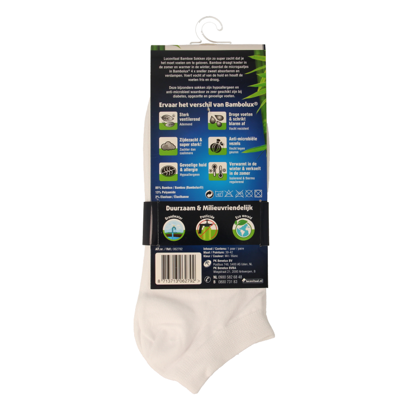 Lucovitaal Bamboe Sokken zijn zo super zacht dat je het moet voelen om te geloven. Bamboe draagt koeler in de zomer en warmer in de winter, doordat de microgaatjes in Bambolux® 4 x sneller zweet absorberen en verdampen. Voert vocht af van de huid en houdt de voeten fris en droog. Deze bijzondere sokken zijn hypoallergeen en anti-microbieel waardoor ze zeer geschikt zijn bij diabetes, opgezette en gevoelige voeten.