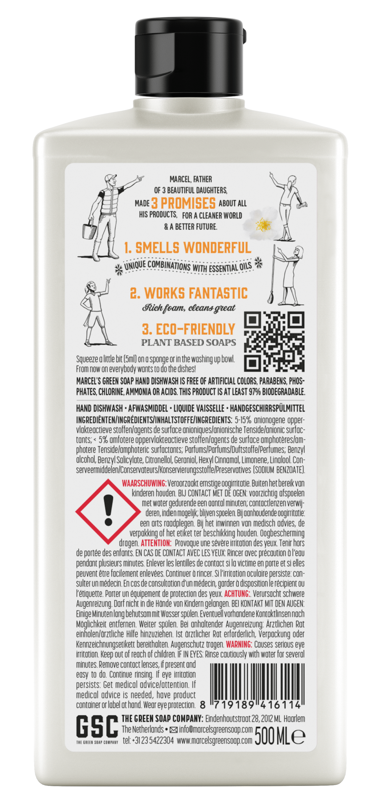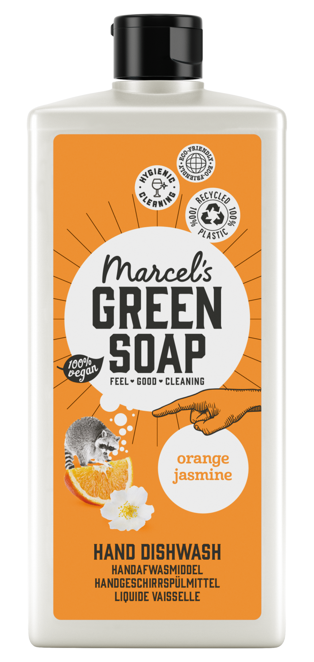 Marcel’s Green Soap afwasmiddel Sinaasappel & Jasmijn is gemaakt van plantaardige zepen, vegan, minstens 97% biologisch afbreekbaar en komt in een fles van 100% gerecycled plastic. Marcel’s Green Soap afwasmiddel is gemaakt van plantaardige zepen en dus vriendelijk voor het milieu, je huis én je lichaam. Verrijkt met essentiële olie van sinaasappel, jasmijn en zonnebloem en een heerlijk natuurlijk sinaasappel & jasmijn parfum, zodat afwassen (we durven het bijna niet te zeggen) een echte ‘geurbeleving’ wordt. En terwijl je wordt opgeslokt door die intense ervaring wordt de huid van je handen gelijk lekker verzorgd door het zachte schuim en de verrijkende ingrediënten. Het doen van de afwas was nog nooit zo ontspannen!