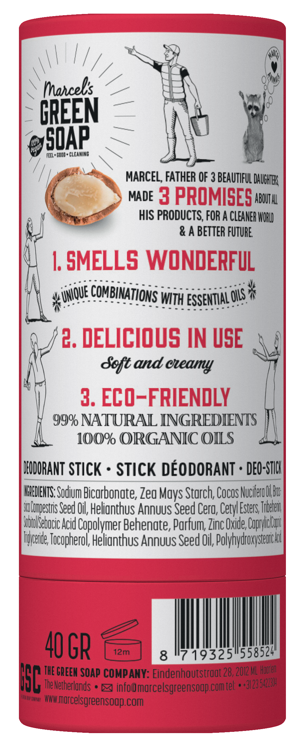 Marcel’s Green Soap deodorant Argan & Oudh is vegan, gemaakt van biologische oliën & baking soda én plasticvrij verpakt. Niet alleen goed voor je huid, maar ook voor de planeet dus. Dat is eigenlijk niet helemaal waar, want met een geur van Argan & Oudh ruikt deze deo-stick superlekker. Maar je begrijpt ons: vervelende geurtjes worden door de ecologische deodorant geneutraliseerd, en dat ook nog eens op een natuurlijke manier. Voor frisse oksels zonder aluminium, zonder alcohol en andere nare chemicaliën. Dat is pas écht fris. Oh, en hadden we al gezegd dat onze deodorant dierproefvrij en 100% vegan is?