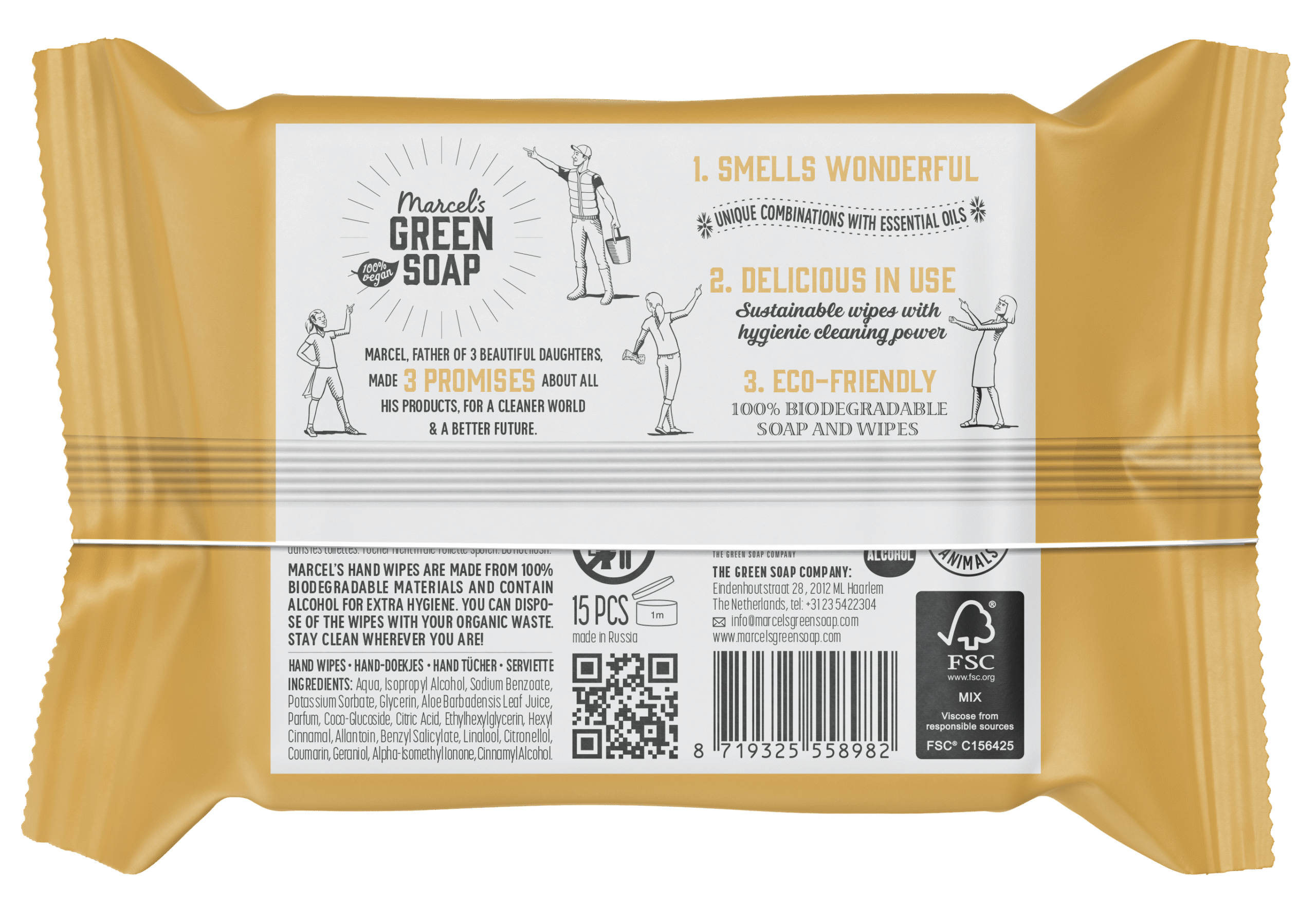 De hygiënische hand doekjes van Marcel’s Green Soap maken niet alleen jouw handen schoon, ze houden ook onze planeet lekker schoon! Gemaakt van 100% biologisch afbreekbare plantaardige vezels én makkelijk mee te nemen zodat je op elk moment je handen kunt reinigen. In elk pak zitten 15 doekjes. Marcel’s hygiënische hand doekjes zijn gemaakt van viscose. Viscose is materiaal, bestaande uit plantaardige vezels gemaakt van planten en houtpulp. Dat is waarom hygiënische doekjes op basis van viscose vezels op natuurlijke wijze afgebroken kunnen worden. De samenstelling van onze viscose bevat zo’n 50% eucalyptus en 50% acacia. Pure plantpower dus!