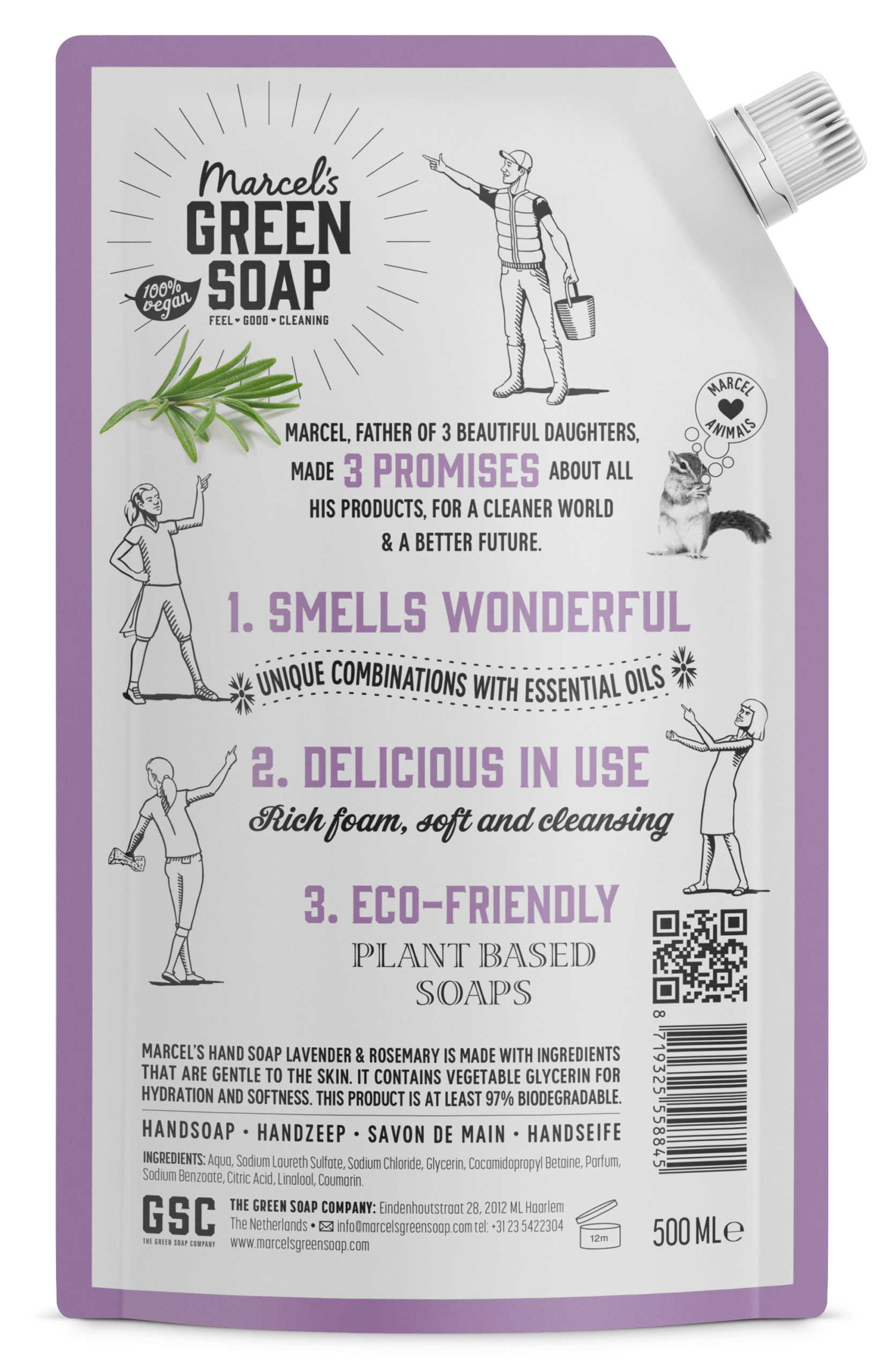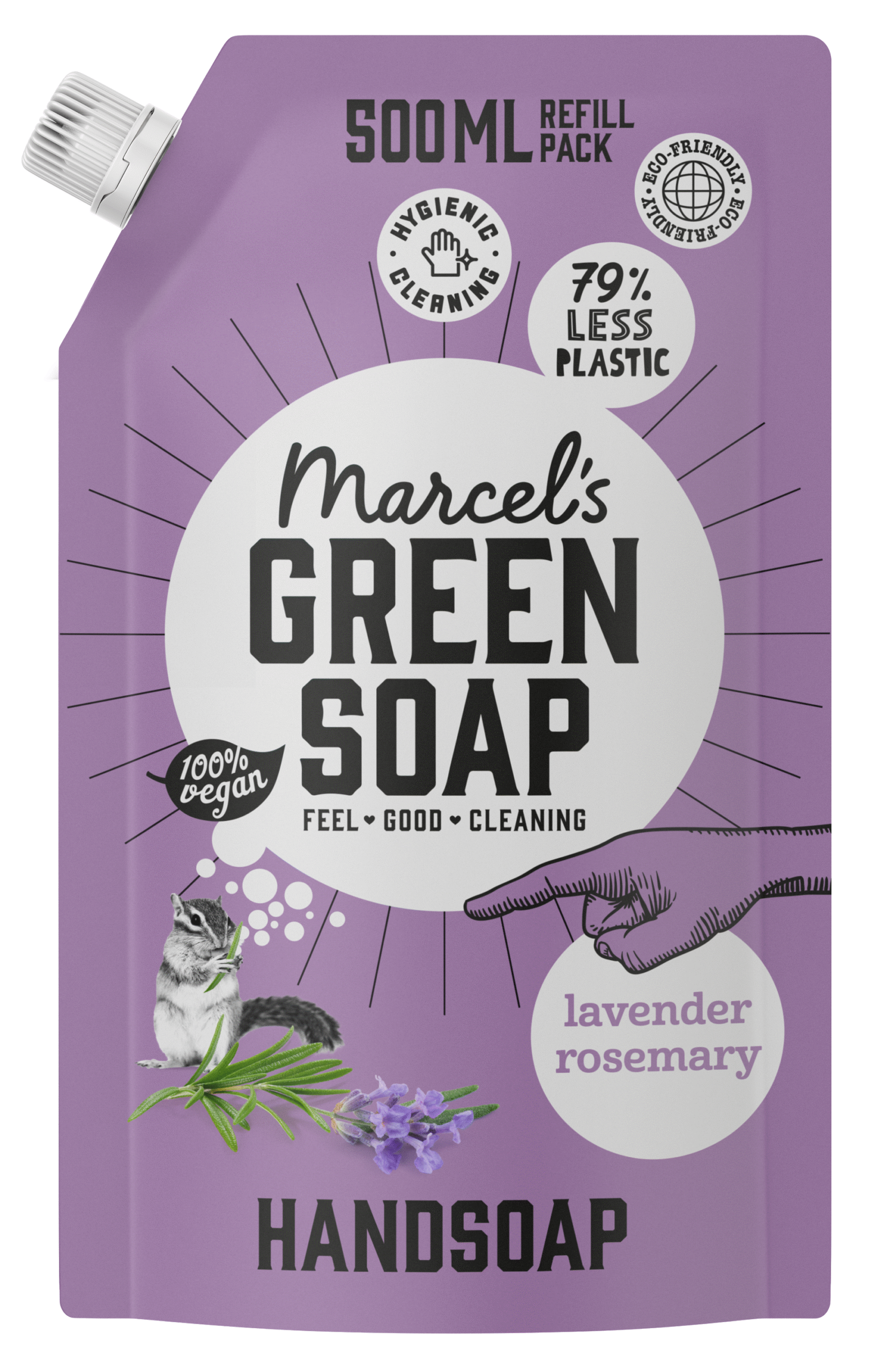 Marcel’s Green Soap handzeep Lavendel & Rozemarijn is gemaakt van plantaardige zepen, minstens 97% biologisch afbreekbaar én verrijkt met plantaardige glycerine voor zachte handen. In tegenstelling tot reguliere handzeep, zit de duurzame handzeep van Marcel bomvol natuurlijke ingrediënten. Stoffen die schadelijk kunnen zijn voor het milieu, je huis of je lichaam zul je dan ook nooit in onze handzeep tegenkomen. Sterker nog, je kunt er lekker vaak je handen mee wassen, want de handzeep bevat plantaardige glycerine die zorgt voor een superzachte huid. En door een ecologische handzeep te gebruiken help je mee bij het schoonhouden van de planeet. Voelt een stuk beter, toch? Dát is handzeep waar je blij van wordt.