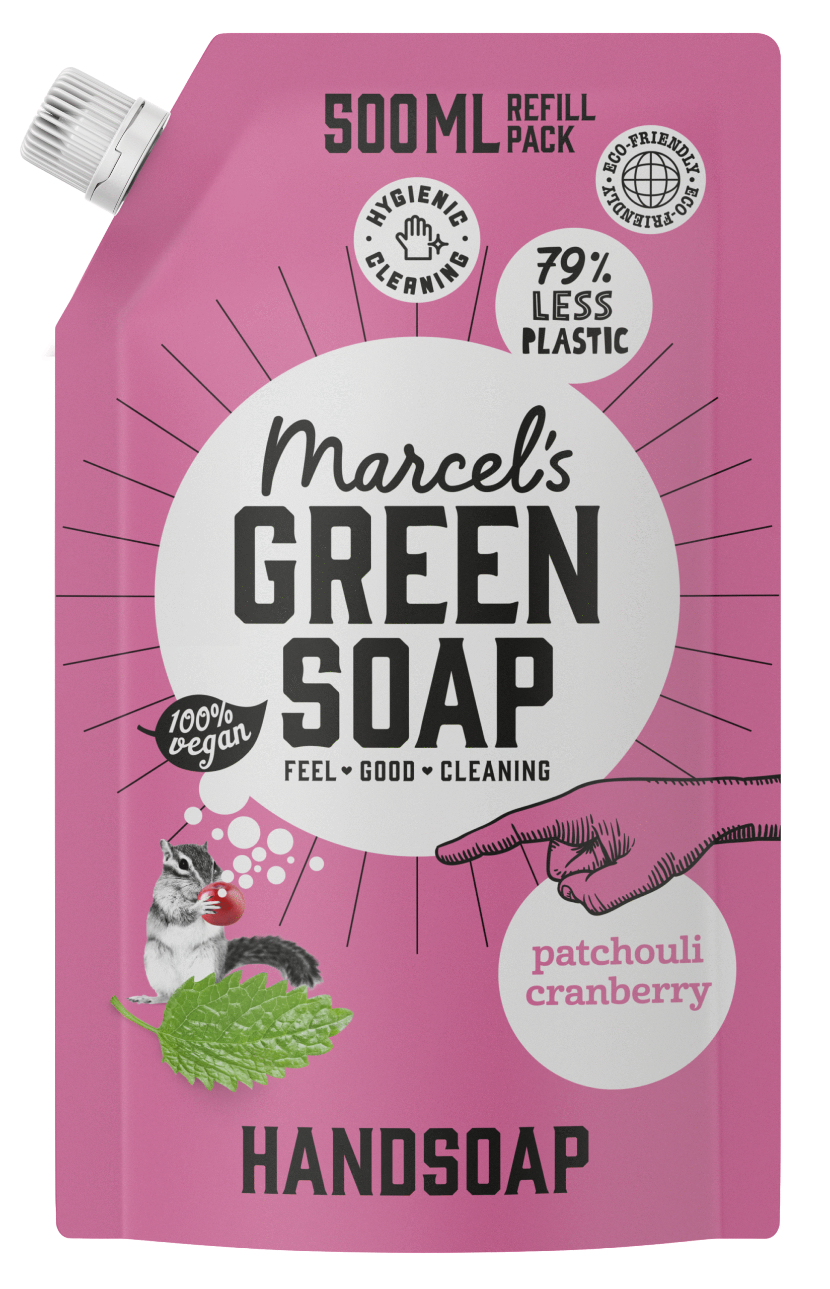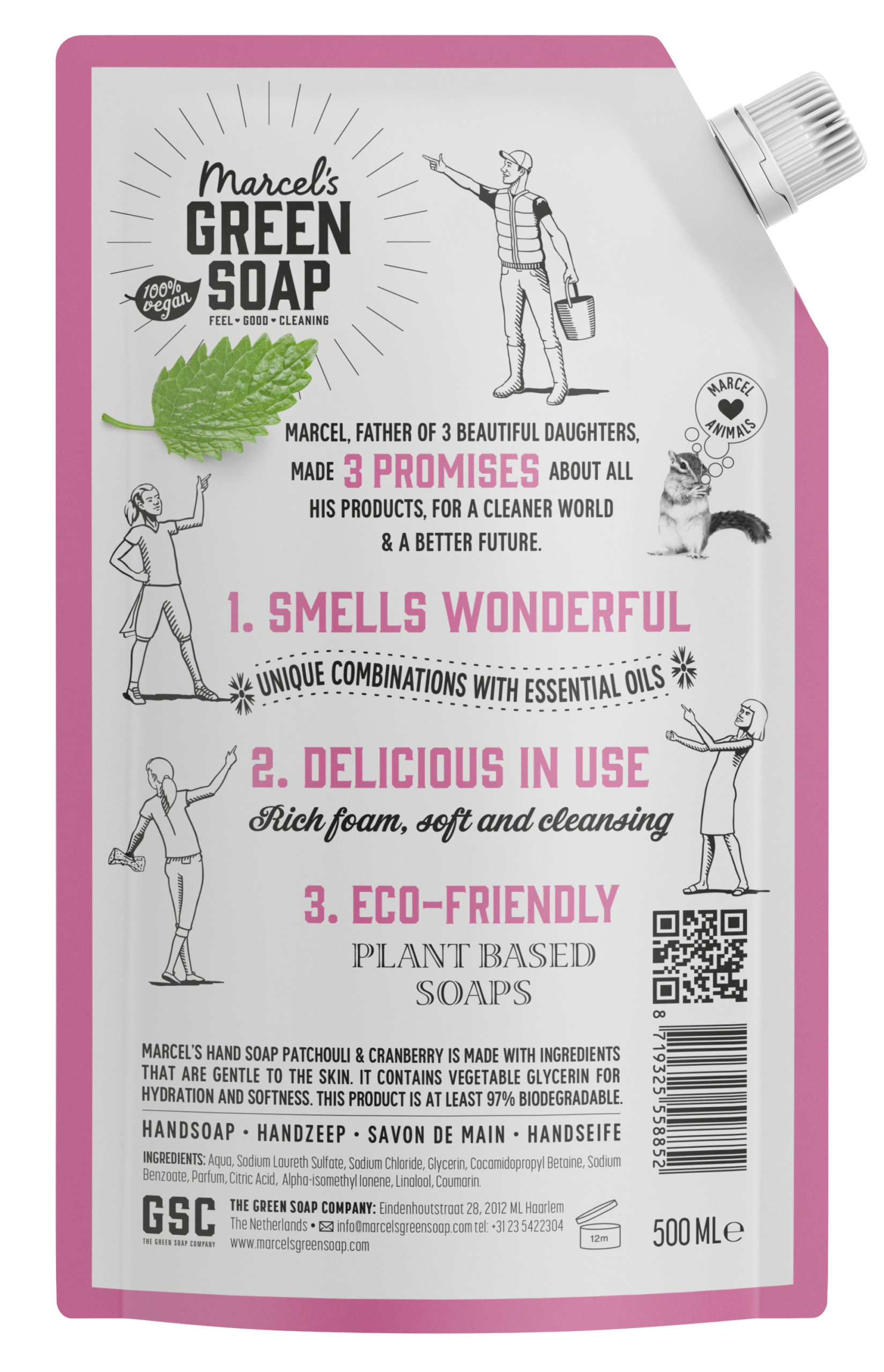 Marcel’s Green Soap handzeep Patchouli & Cranberry is gemaakt van plantaardige zepen, minstens 97% biologisch afbreekbaar én verrijkt met plantaardige glycerine voor zachte handen. In tegenstelling tot reguliere handzeep, zit de duurzame handzeep van Marcel bomvol natuurlijke ingrediënten. Stoffen die schadelijk kunnen zijn voor het milieu, je huis of je lichaam zul je dan ook nooit in onze handzeep tegenkomen. Sterker nog, je kunt er lekker vaak je handen mee wassen, want de handzeep bevat plantaardige glycerine die zorgt voor een superzachte huid. En door een ecologische handzeep te gebruiken help je mee bij het schoonhouden van de planeet. Voelt een stuk beter, toch? Dát is handzeep waar je blij van wordt.