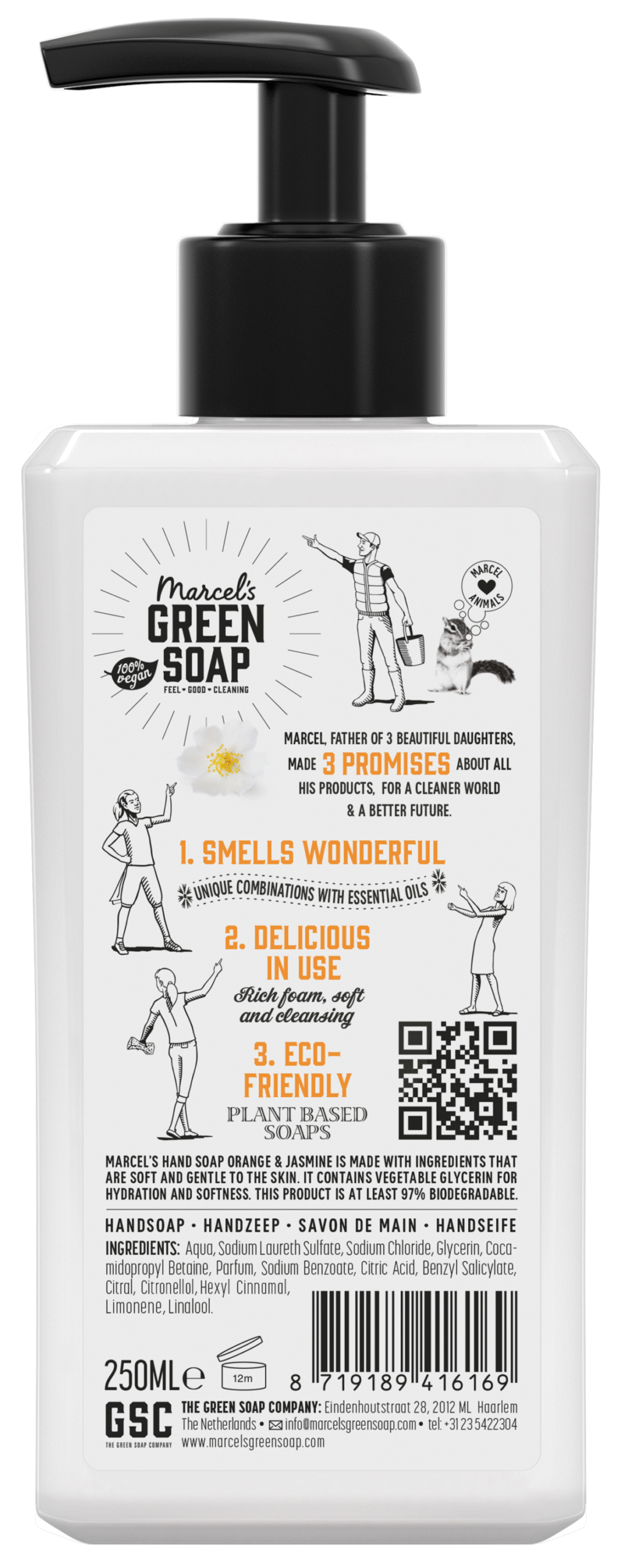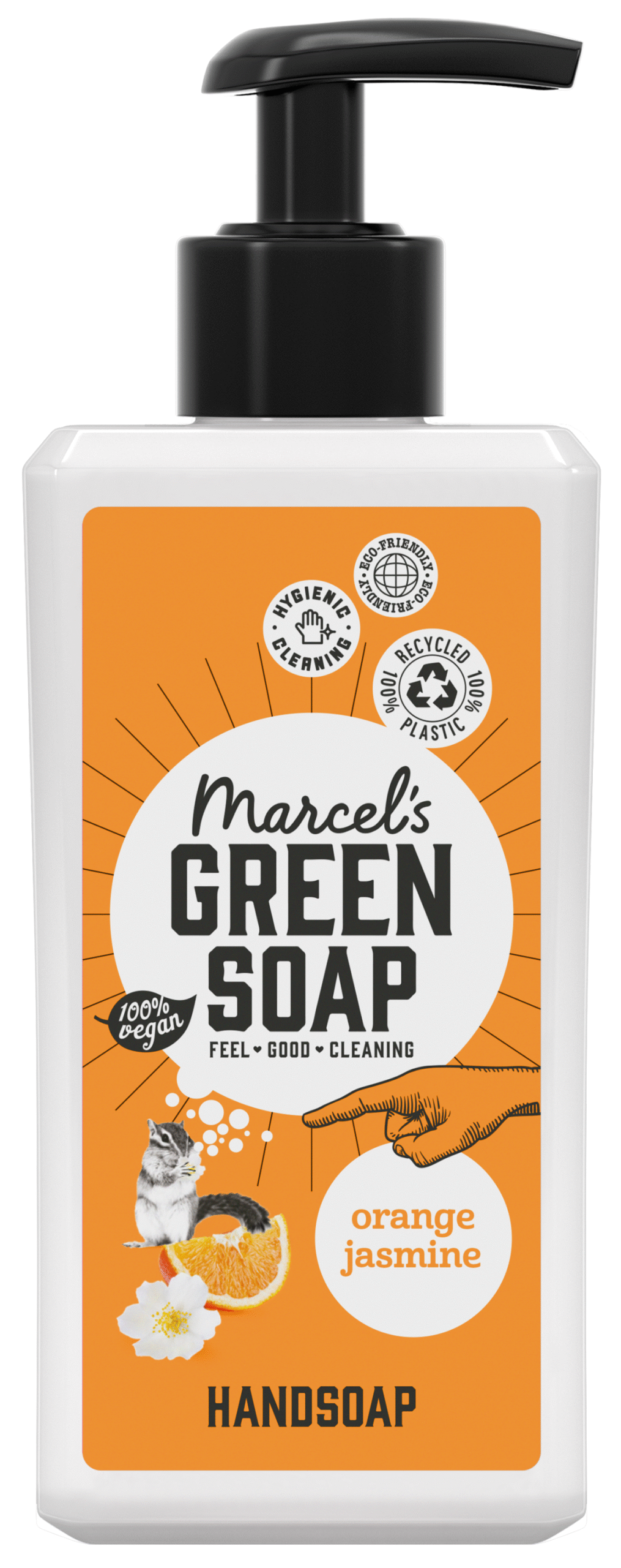 Marcel’s Green Soap handzeep Sinaasappel & Jasmijn is gemaakt van plantaardige zepen, minstens 97% biologisch afbreekbaar én verrijkt met plantaardige glycerine voor zachte handen. In tegenstelling tot reguliere handzeep, zit de duurzame handzeep van Marcel bomvol natuurlijke ingrediënten. Stoffen die schadelijk kunnen zijn voor het milieu, je huis of je lichaam zul je dan ook nooit in onze handzeep tegenkomen. Sterker nog, je kunt er lekker vaak je handen mee wassen, want de handzeep bevat plantaardige glycerine die zorgt voor een superzachte huid. En door een ecologische handzeep te gebruiken help je mee bij het schoonhouden van de planeet. Voelt een stuk beter, toch? Dát is handzeep waar je blij van wordt.