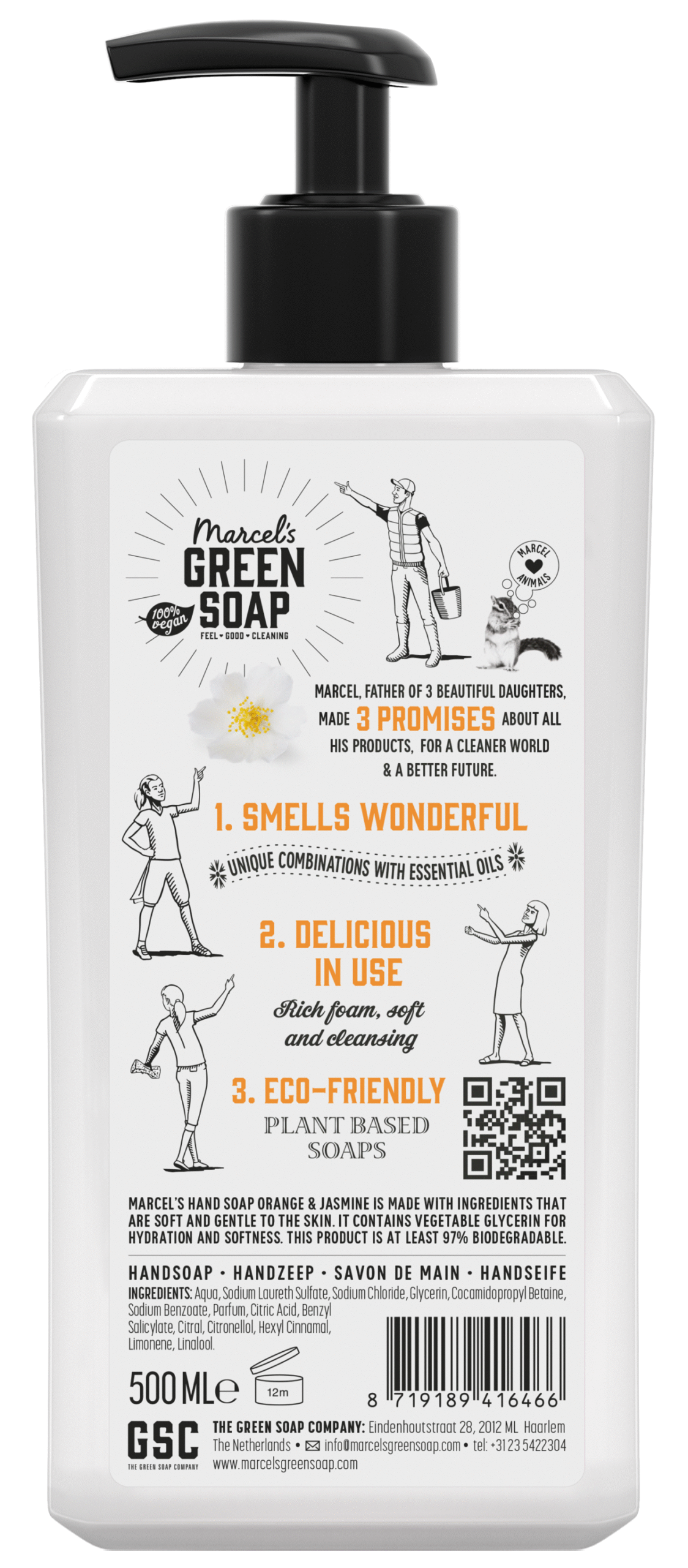 Marcel’s Green Soap handzeep Sinaasappel & Jasmijn is gemaakt van plantaardige zepen, minstens 97% biologisch afbreekbaar én verrijkt met plantaardige glycerine voor zachte handen. In tegenstelling tot reguliere handzeep, zit de duurzame handzeep van Marcel bomvol natuurlijke ingrediënten. Stoffen die schadelijk kunnen zijn voor het milieu, je huis of je lichaam zul je dan ook nooit in onze handzeep tegenkomen. Sterker nog, je kunt er lekker vaak je handen mee wassen, want de handzeep bevat plantaardige glycerine die zorgt voor een superzachte huid. En door een ecologische handzeep te gebruiken help je mee bij het schoonhouden van de planeet. Voelt een stuk beter, toch? Dát is handzeep waar je blij van wordt.