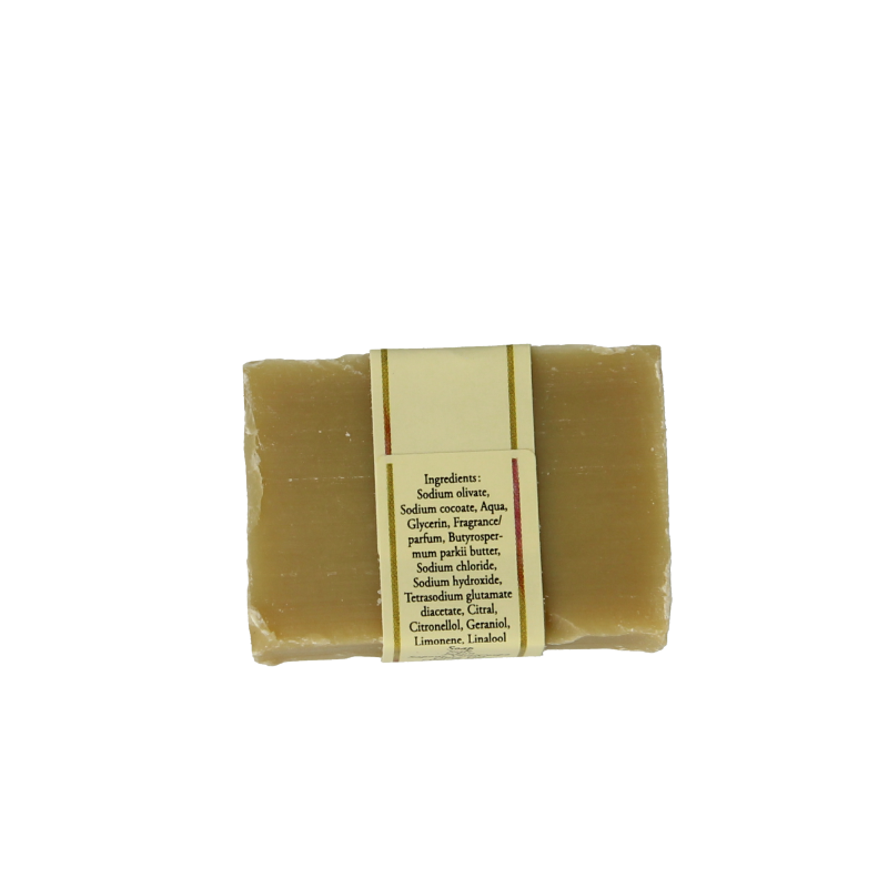 Sodium olivate, Sodium cocoate, Aqua, Glycerin, Fragrance/Parfum, Butyrospermum parkii butter, Sodium chloride, Sodium hydroxide, Tetrasodium Gutamate diacetate, Citral, Citronellol, Geraniol, Limonene, Linalool.