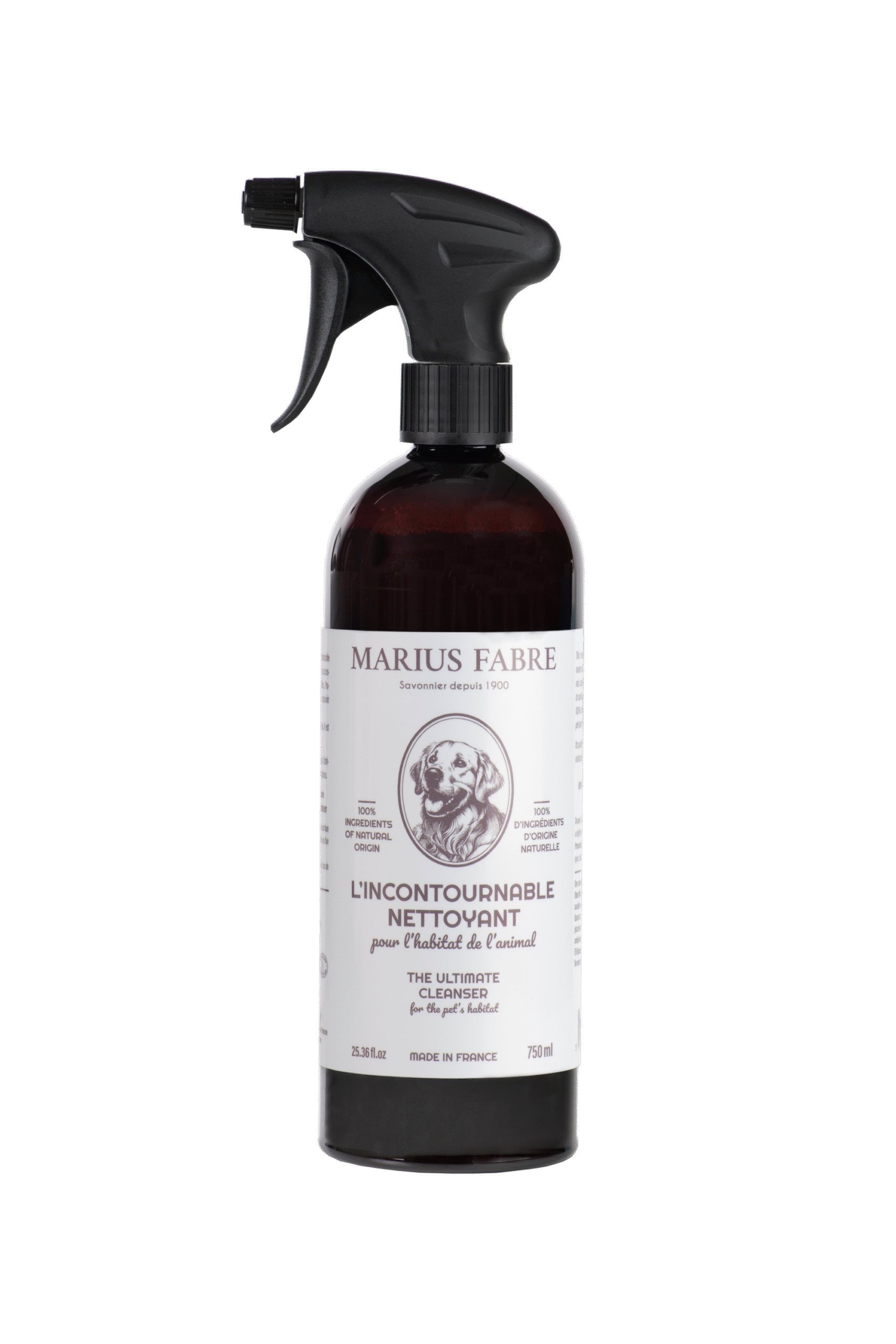 Deze gebruiksklare spray van Marius Fabre wordt al snel het onmisbare product voor het dagelijks onderhoud van kleine oppervlakken en de accessoires van uw hond (voerbak, kennel, mat, speeltje, halsband, enz.). 100% natuurlijk en parfumvrij. Deze schoonmaakzeep respecteert het welzijn van uw huisdier en verstoort zijn reukzin of gewoonten niet. De zeep is afkomstig van onze ambachtelijke productie in Salon-de-Provence.