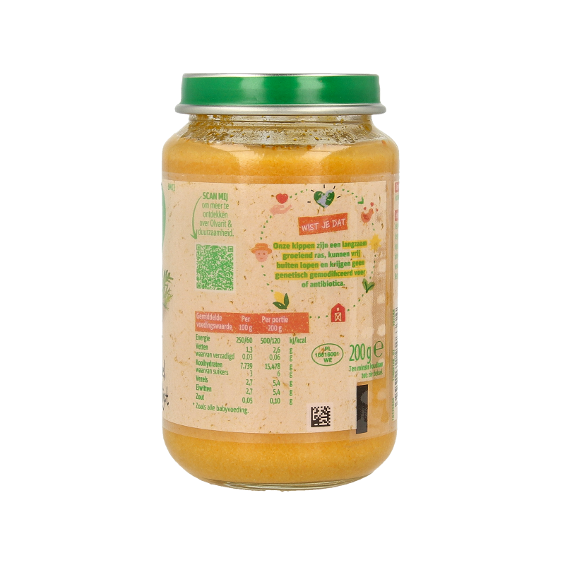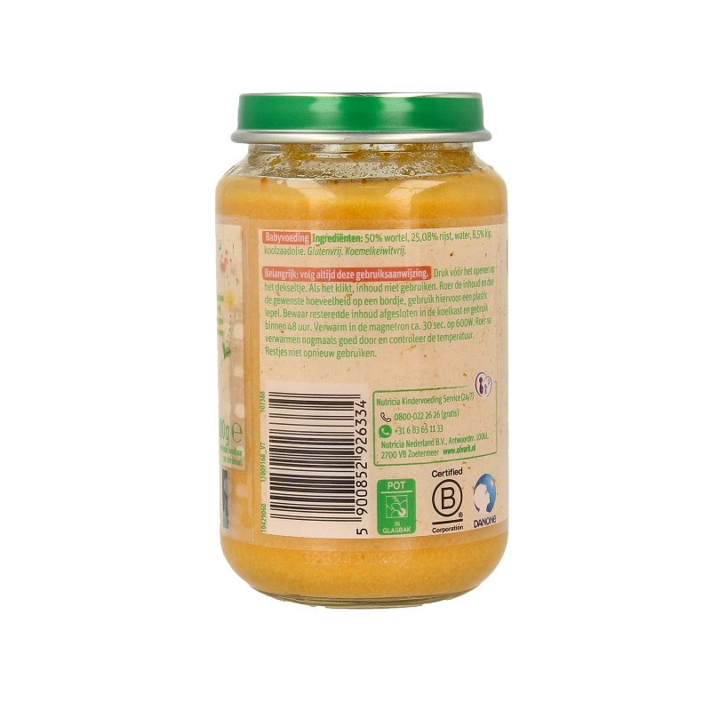 50% wortel, 25,08% rijst, 15,4% water (nodig voor bereiding), 8,5% kip, koolzaadolie.